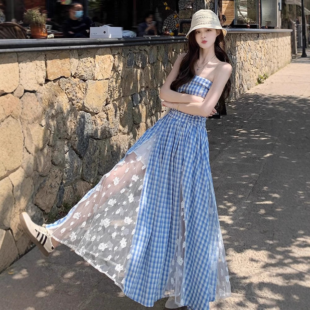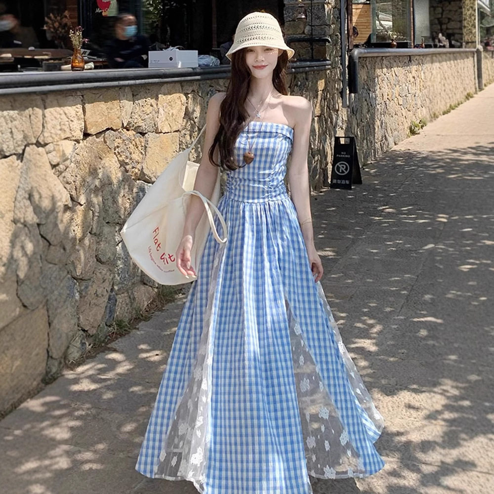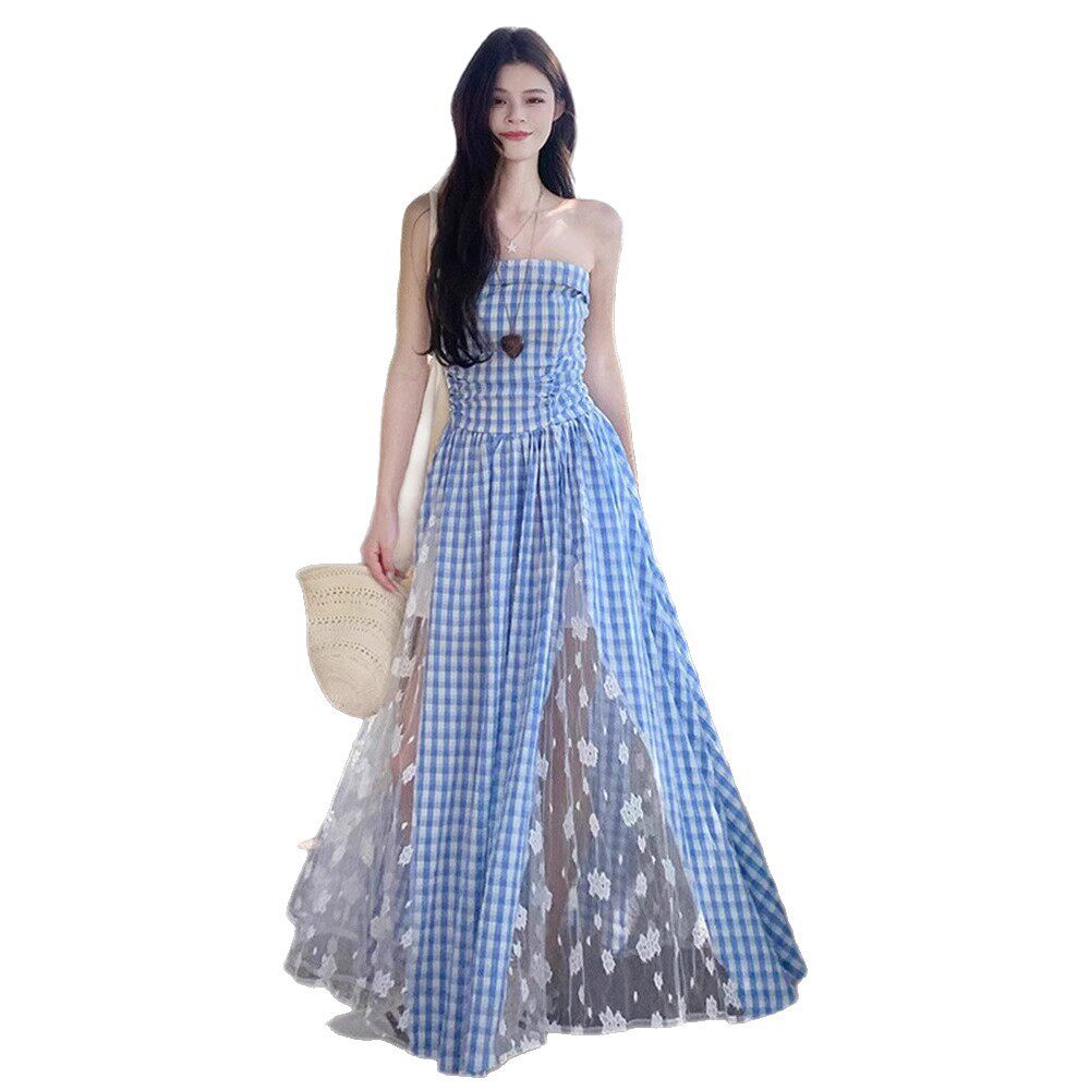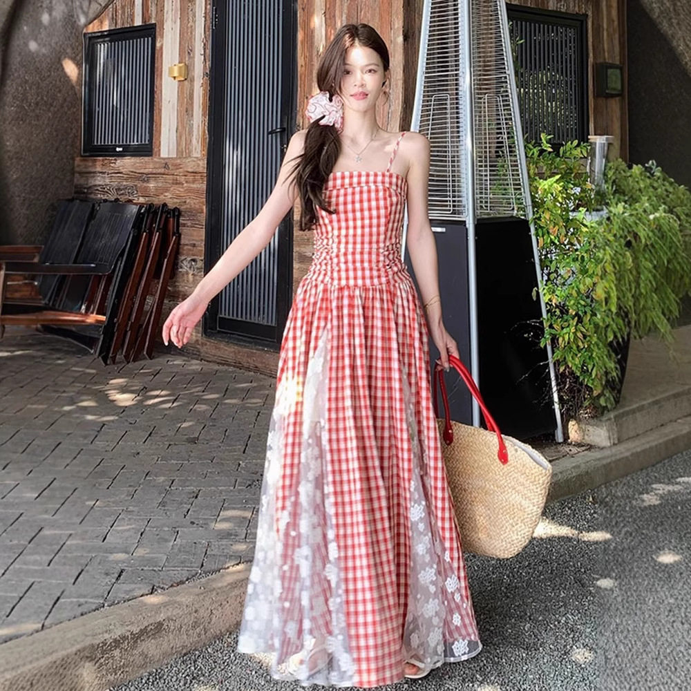 波西米亚红色格子吊带连衣裙女夏2026新款 多巴胺云南海边度假长裙