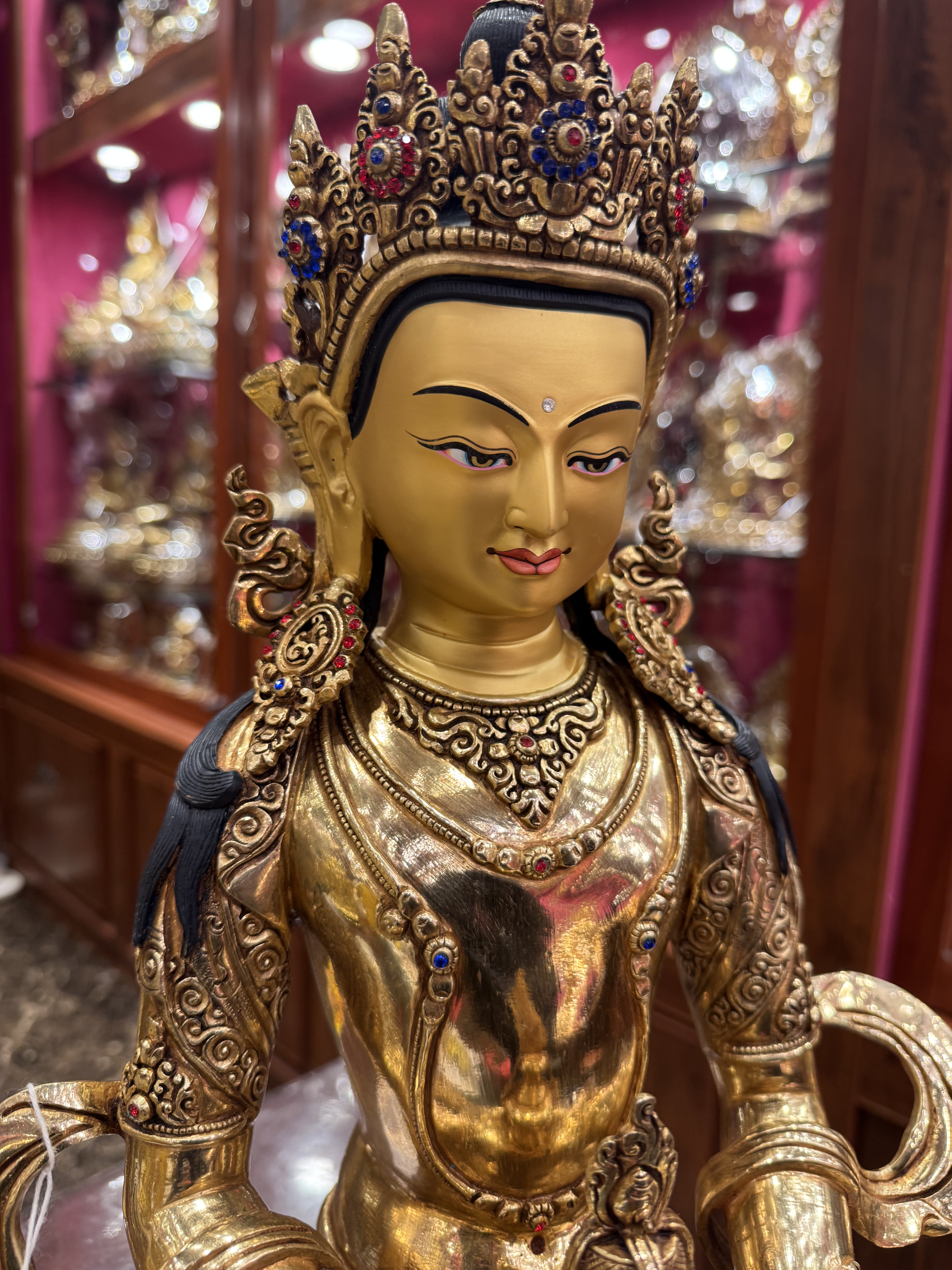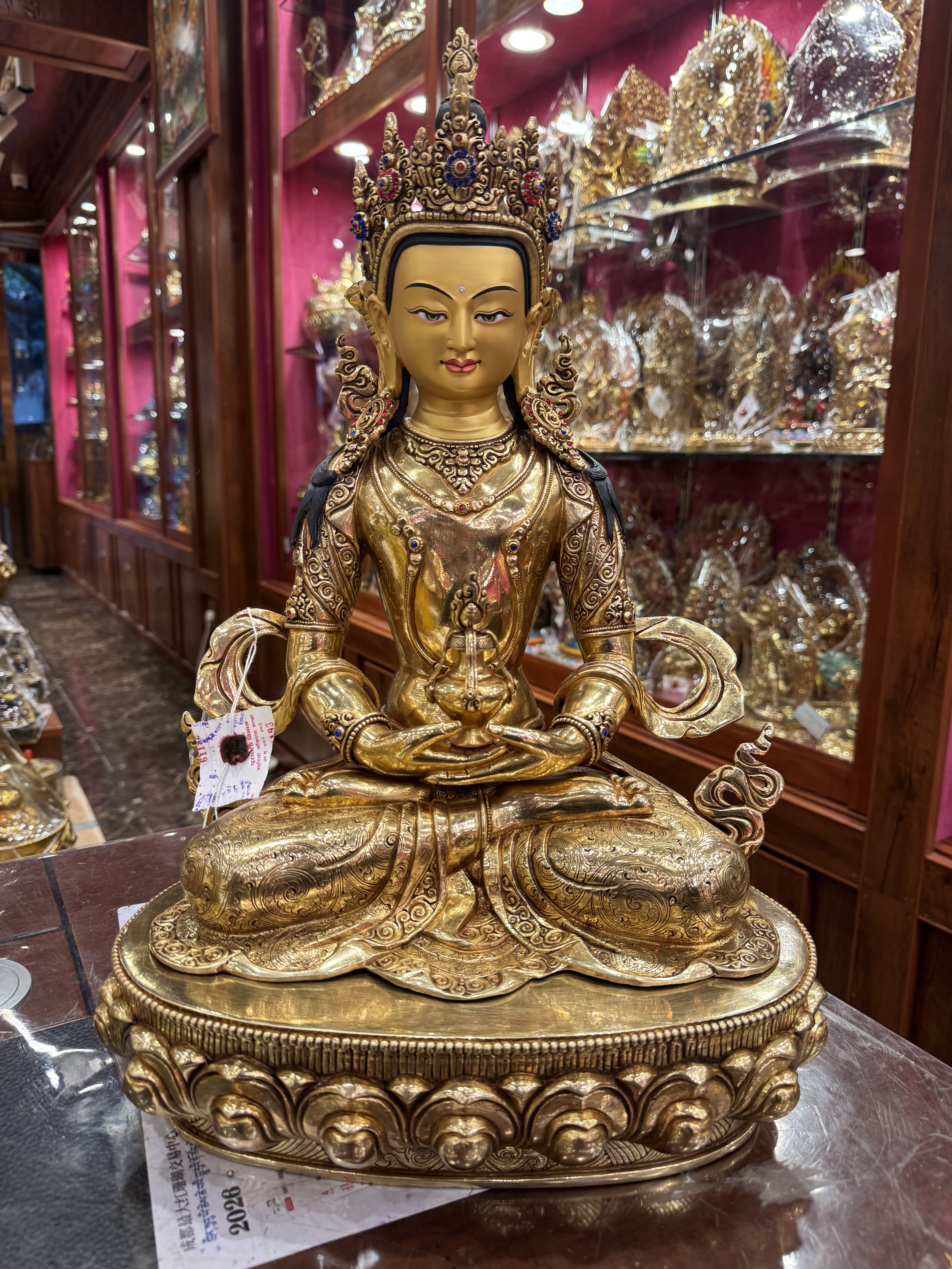 尼泊尔精工工艺紫铜鎏金一尺五长寿佛铜像