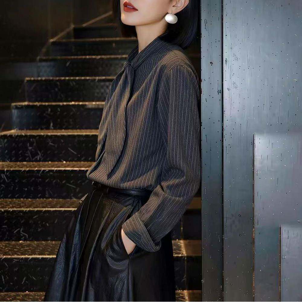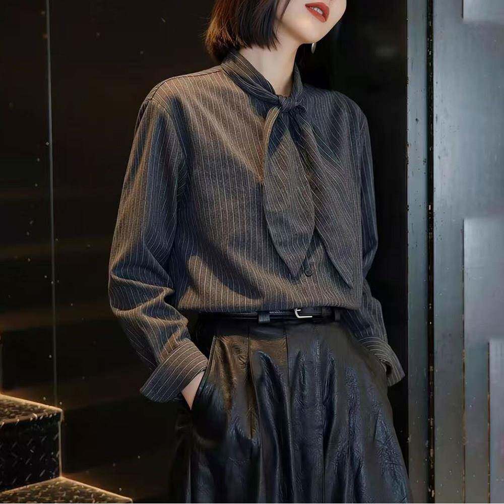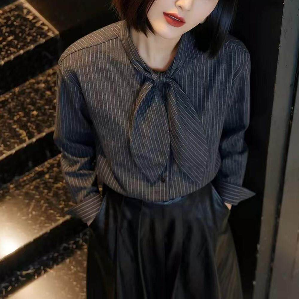 气质减龄宽松显瘦休闲上衣0325z 新款 春夏灰色飘带领衬衫 女士长袖
