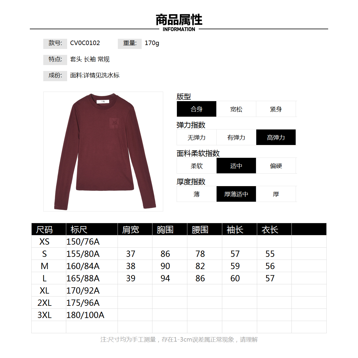 深圳南油CV0C0102套头长袖 打底上衣高弹T恤女3.24春