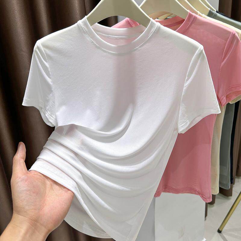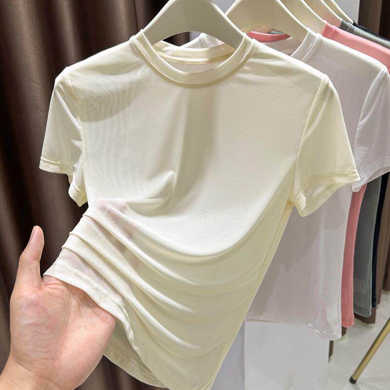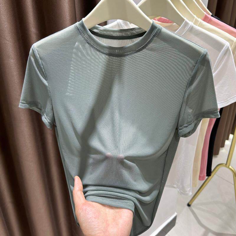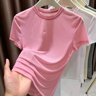 杏色上衣0313z 薄款 春夏网纱短袖 小圆领t恤女纱衣蕾丝打底衫