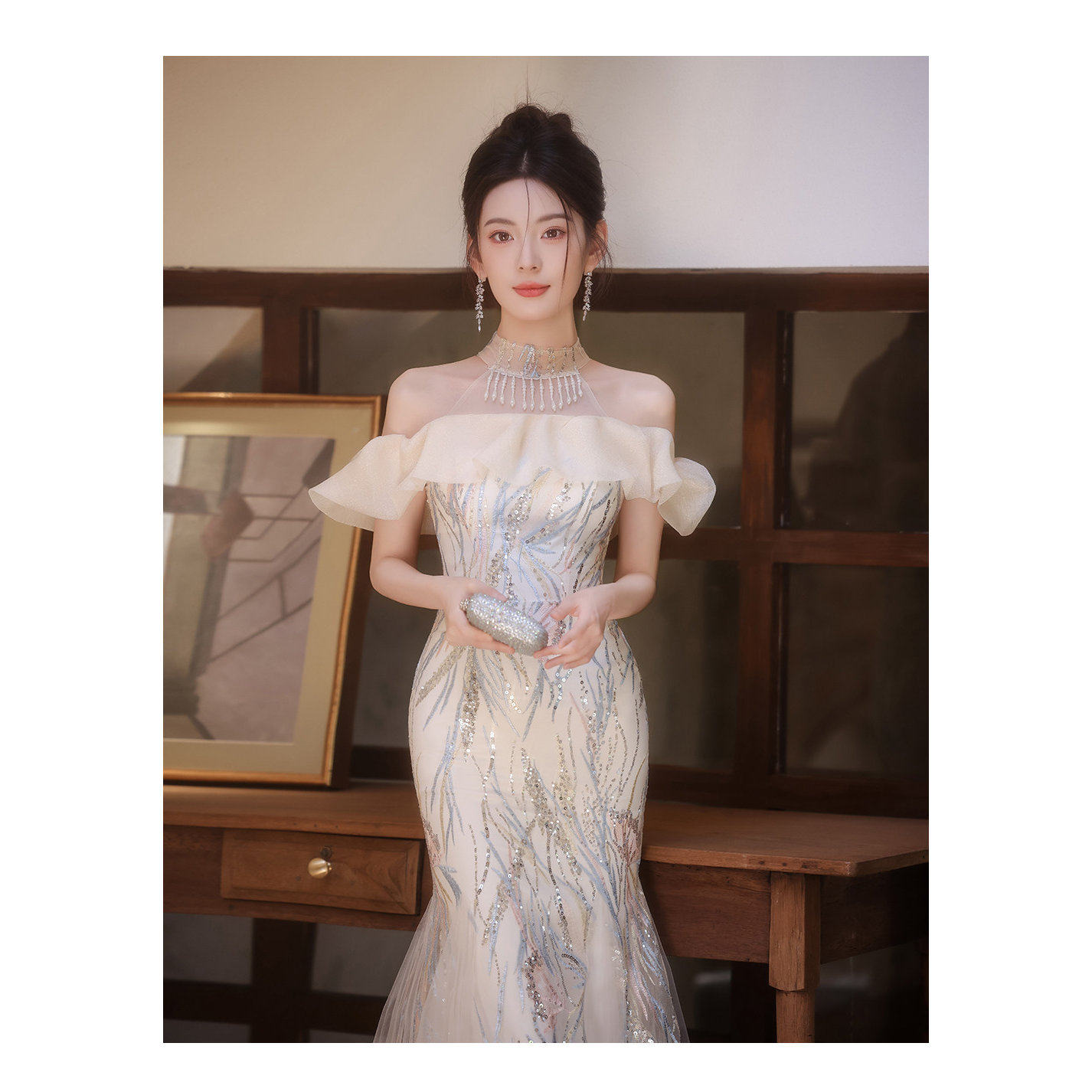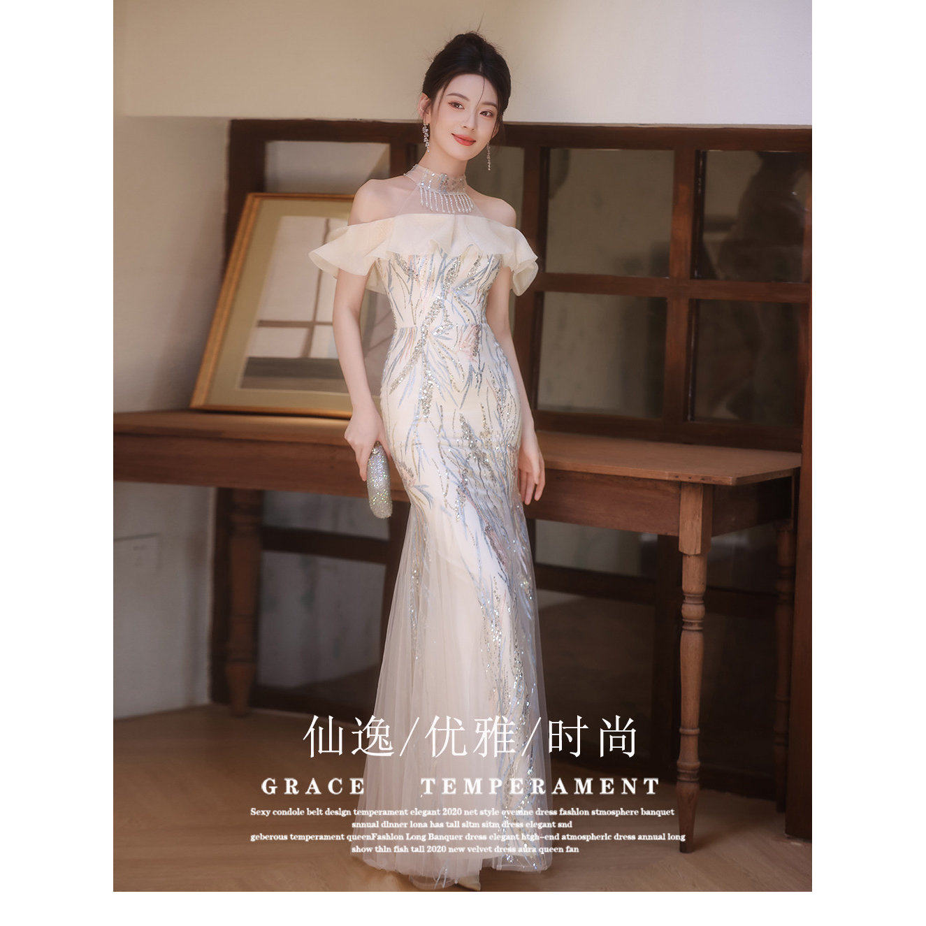出租绝美一字肩晚礼服女高级感年会气质主持人轻奢高端订婚鱼尾裙