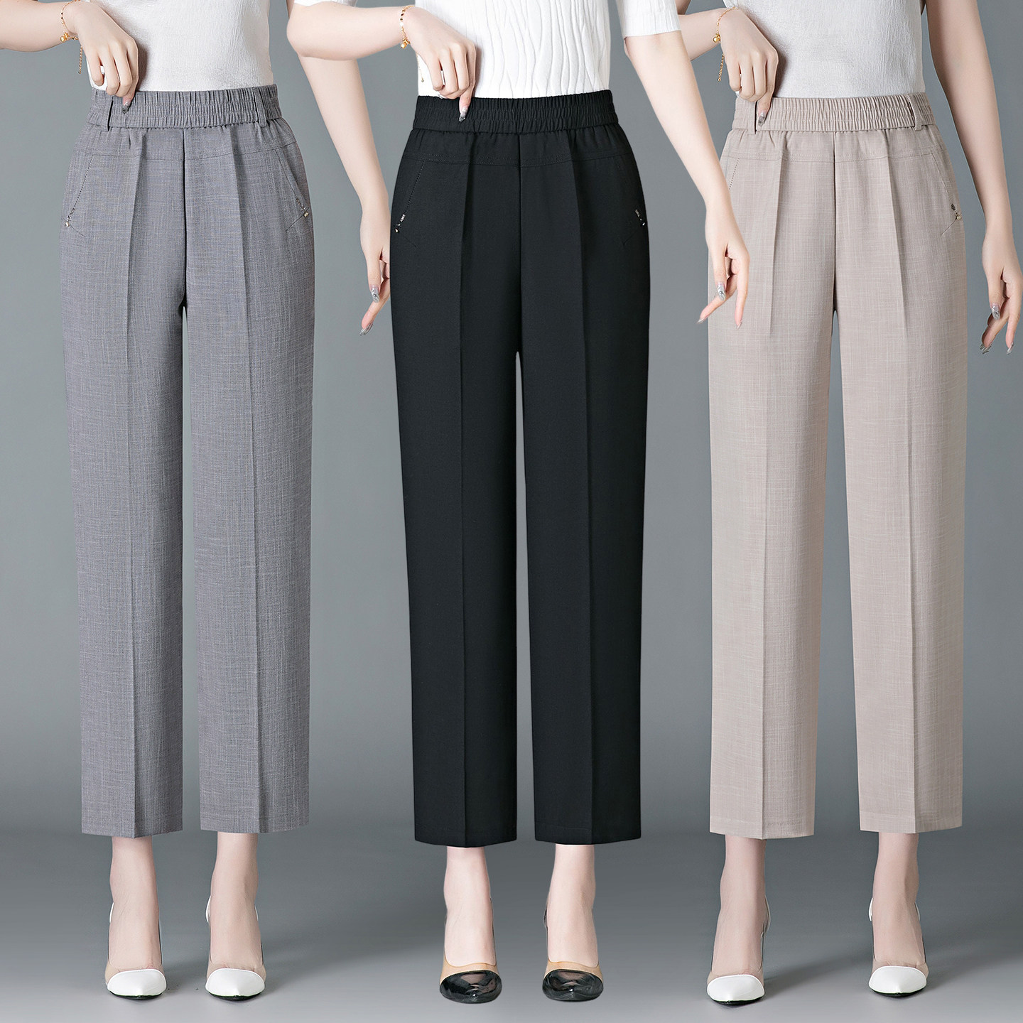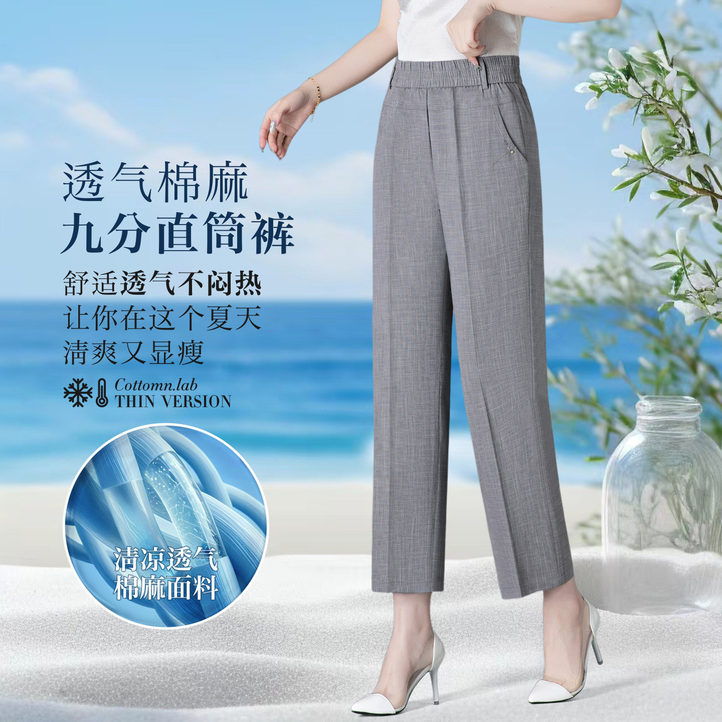 子女夏季 大码 棉麻薄款 高腰直筒中老年人宽松休闲女裤 九分裤 妈妈裤