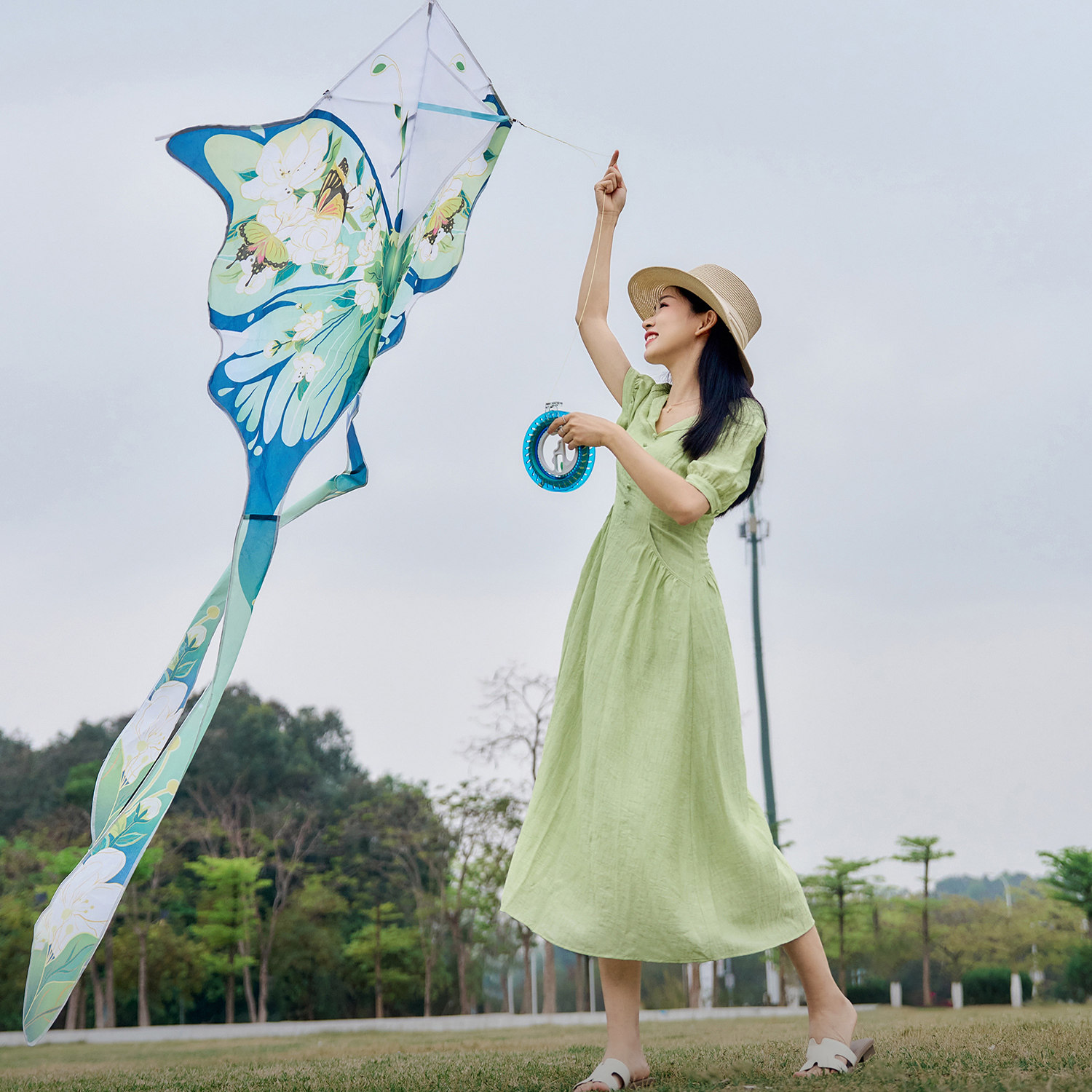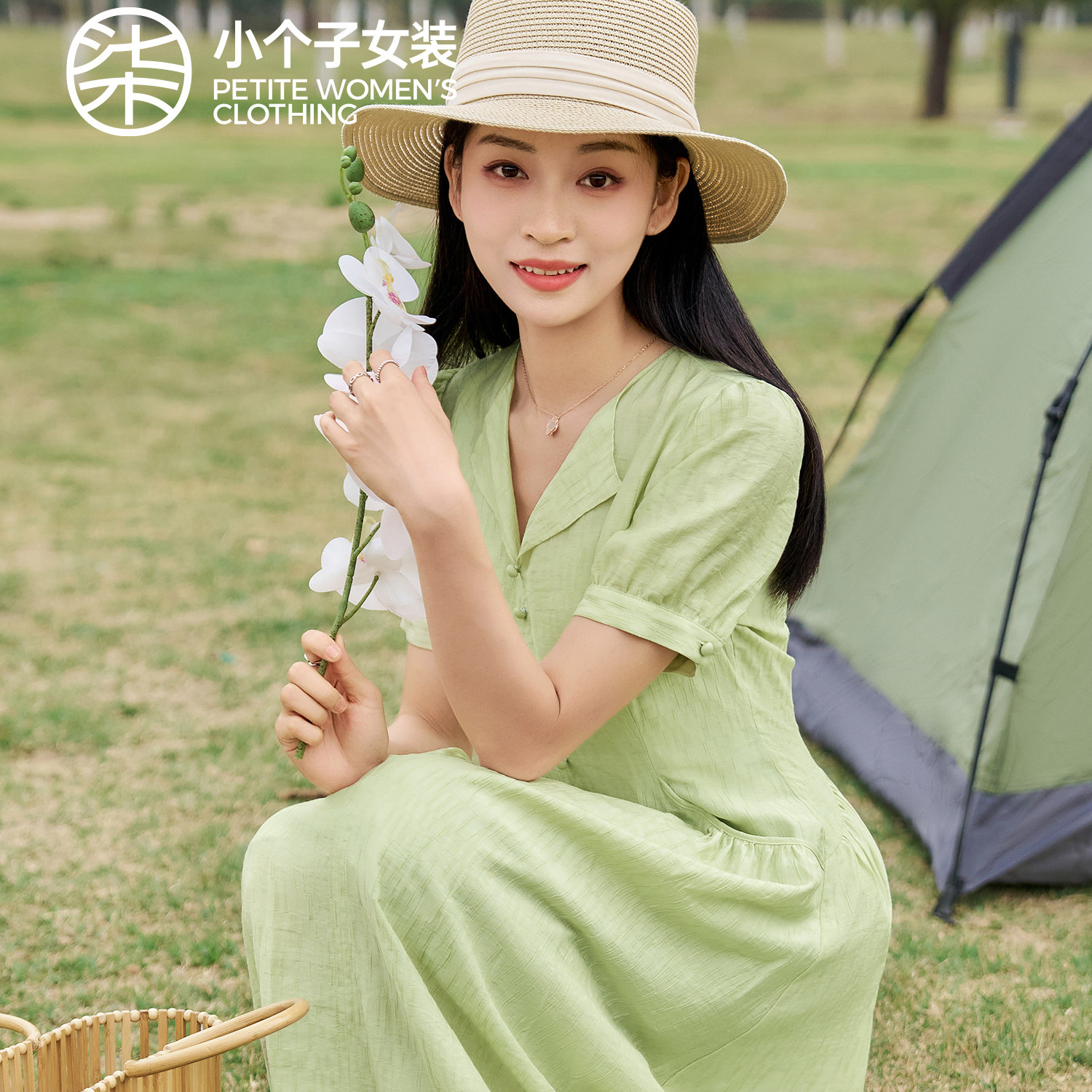 柒量一裁小个子绿色v领纽扣收腰短袖 连衣裙夏日长裙0325活动