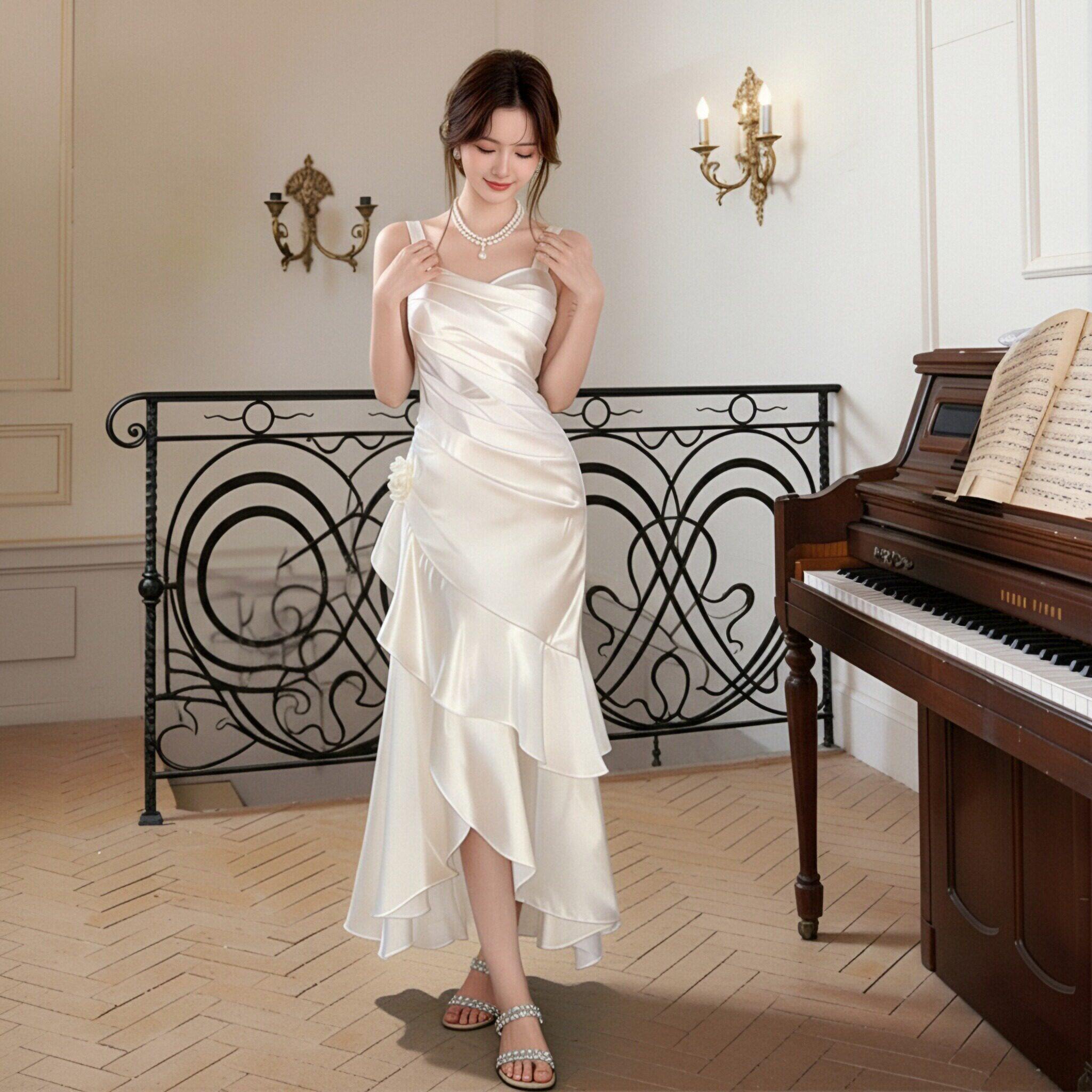 香槟色吊带收腰长裙不规则鱼尾裙摆性感气质晚礼服裙名媛风连衣裙