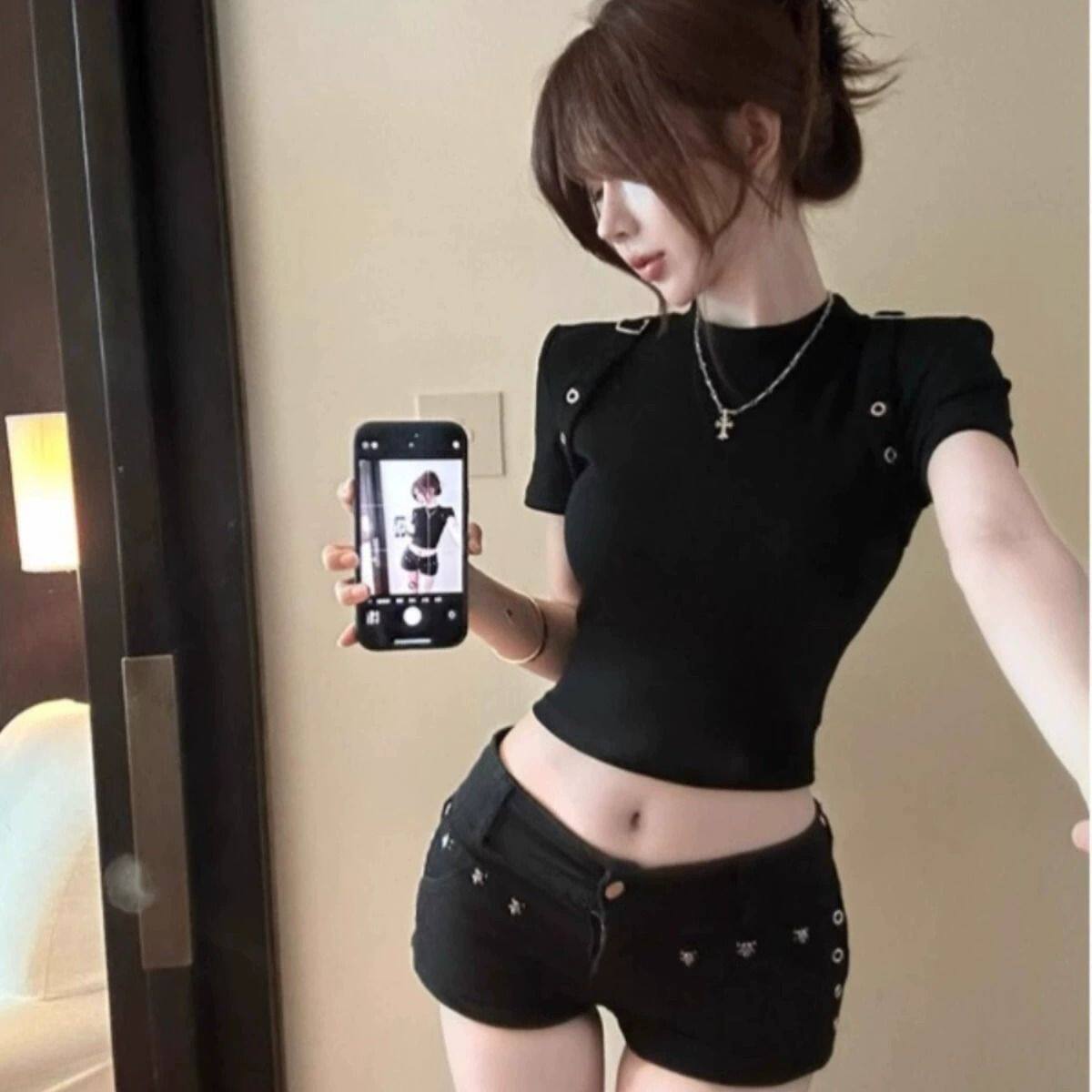 上衣高级感独特半袖 美式 纯欲甜辣妹短款 t恤女夏季 小高领垫肩短袖