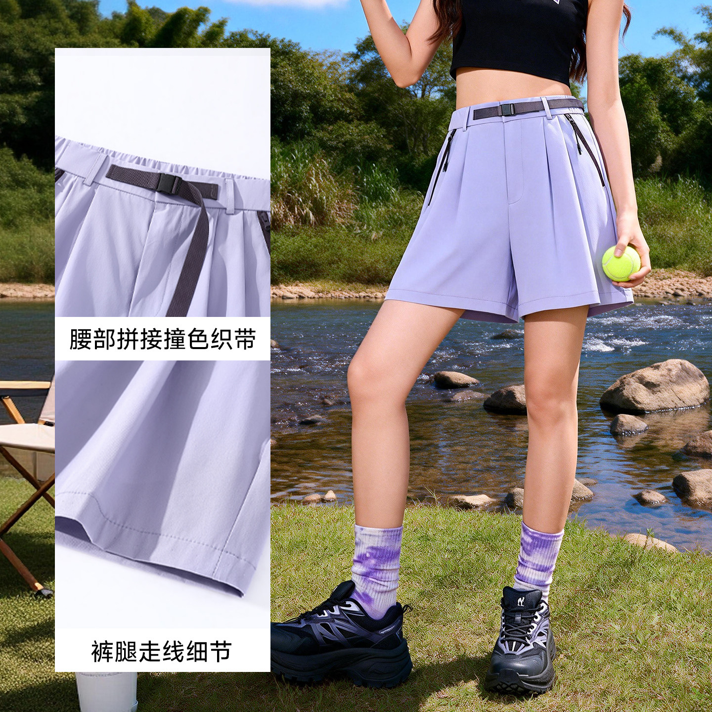小个子高腰显瘦宽松休闲五分裤 女夏新款 短裤 班尼路紫色速干工装