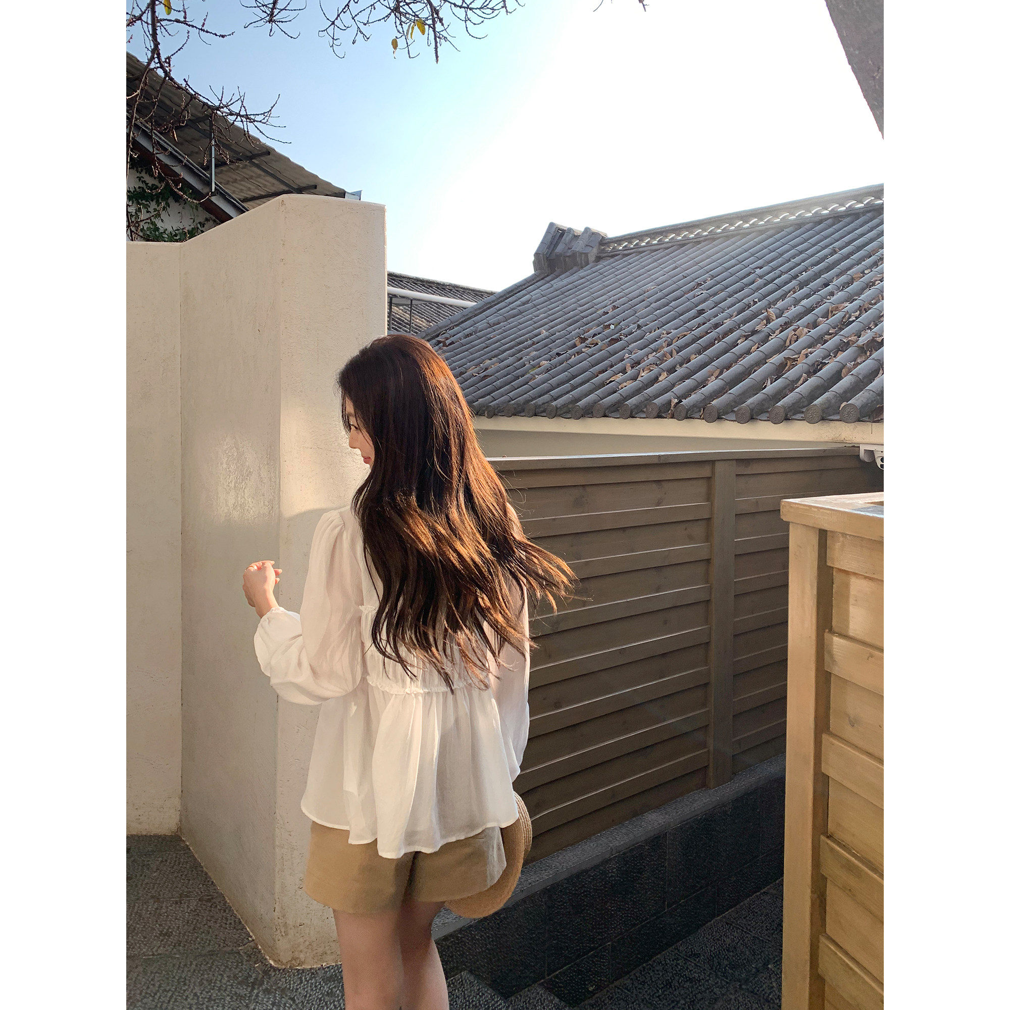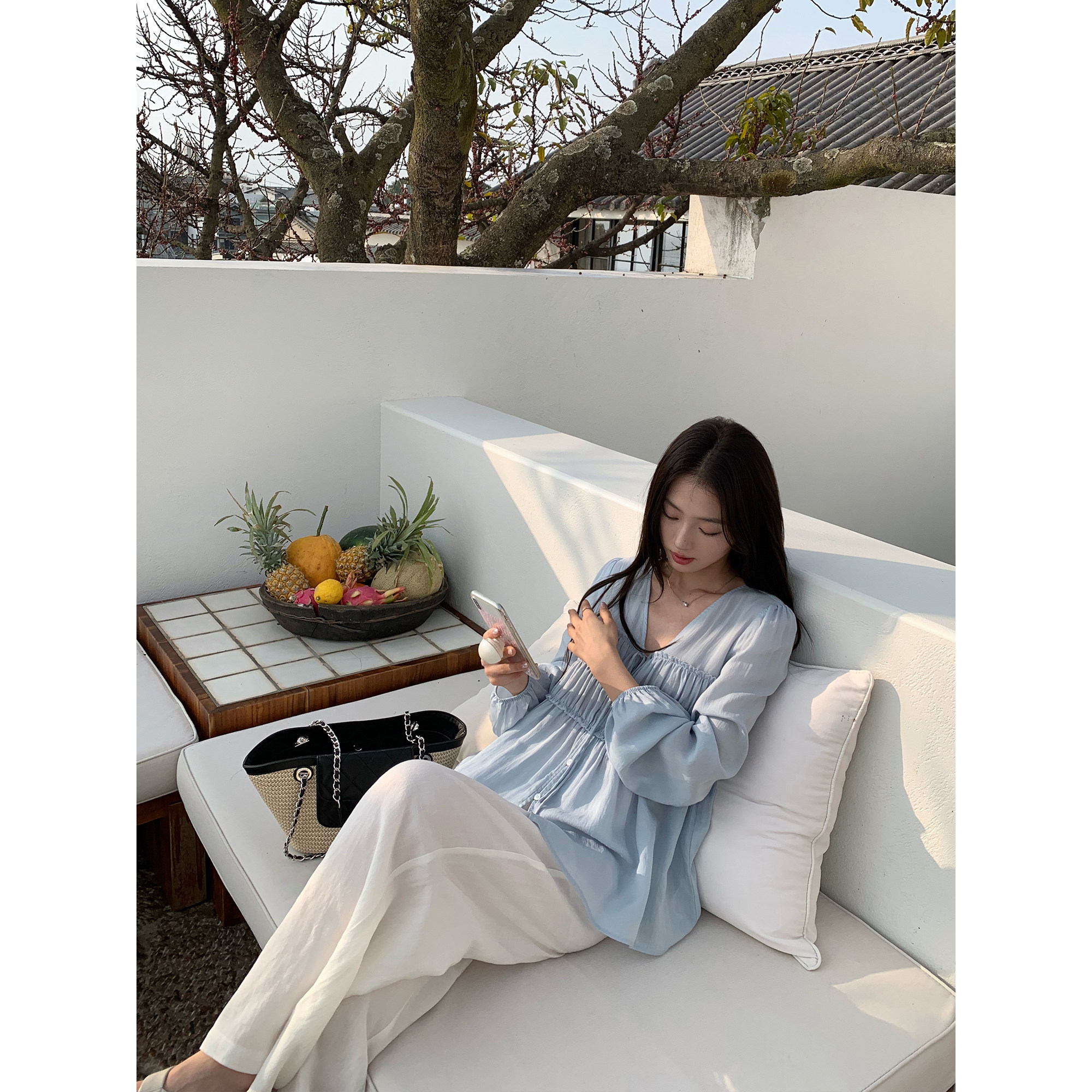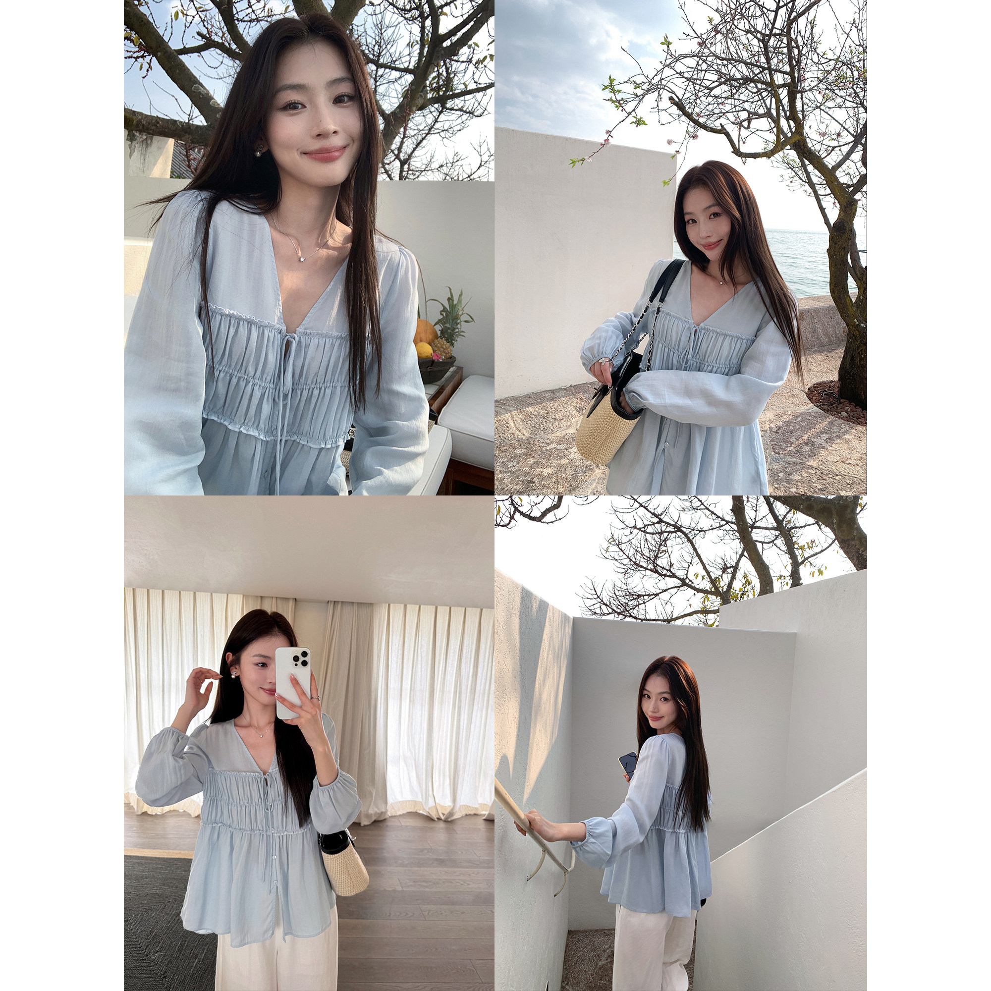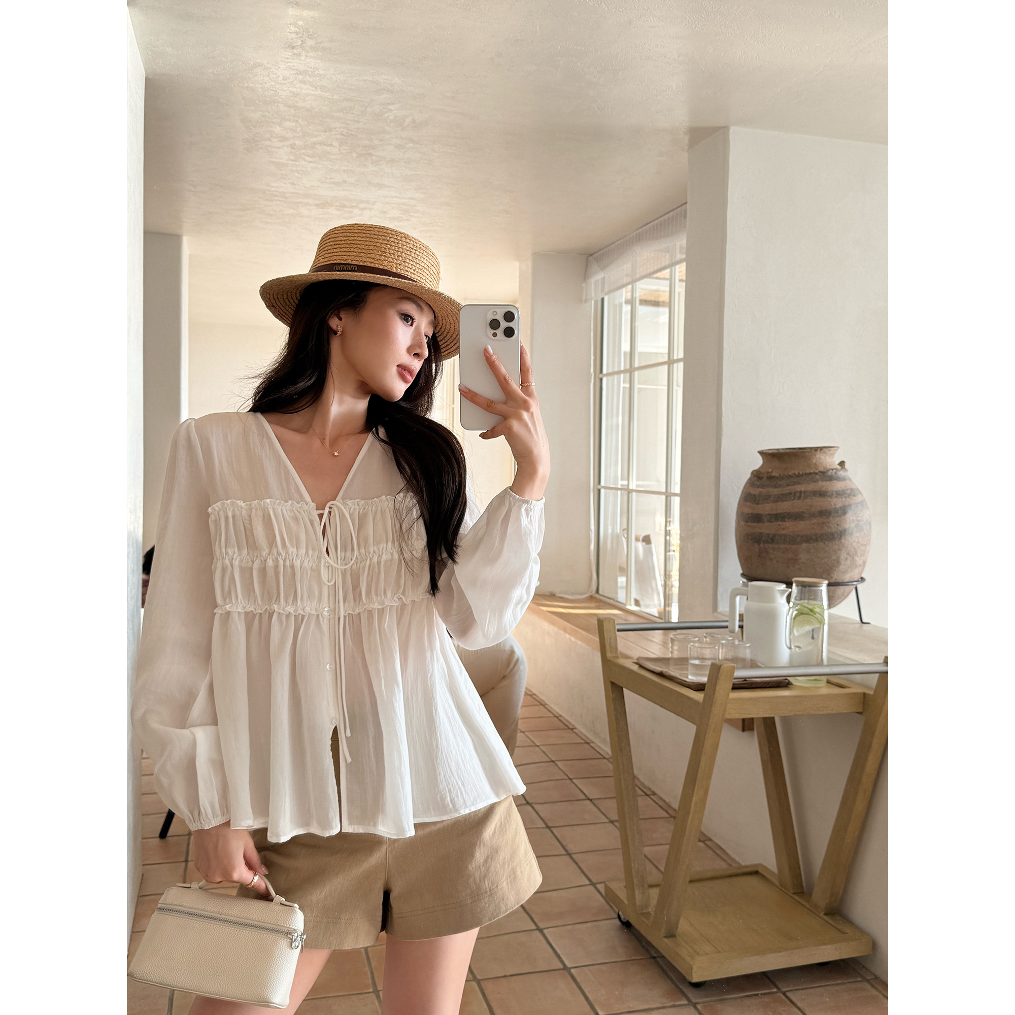 女褶皱设计感防晒系带衬衣 莱赛尔V领衬衫 pusumede 夏日琉光感