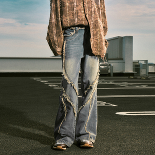 高街直筒阔腿裤 男秋冬加绒复古美式 微喇牛仔裤 120cm高个子加长版