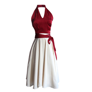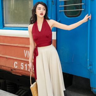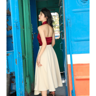 设计感女夏 伞裙半身裙两件套裙装 赫本风复古挂脖红色上衣法式 套装