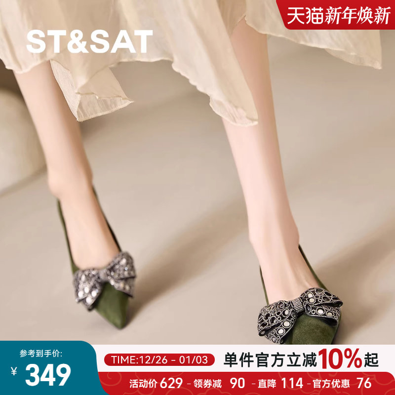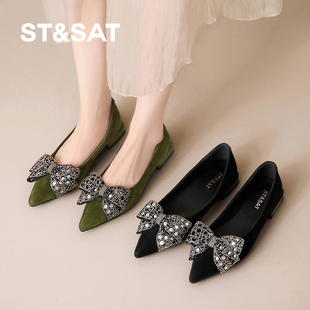 绒面尖头平底通勤鞋 星期六法式 新款 女夏季 绝美水钻蝴蝶结浅口单鞋