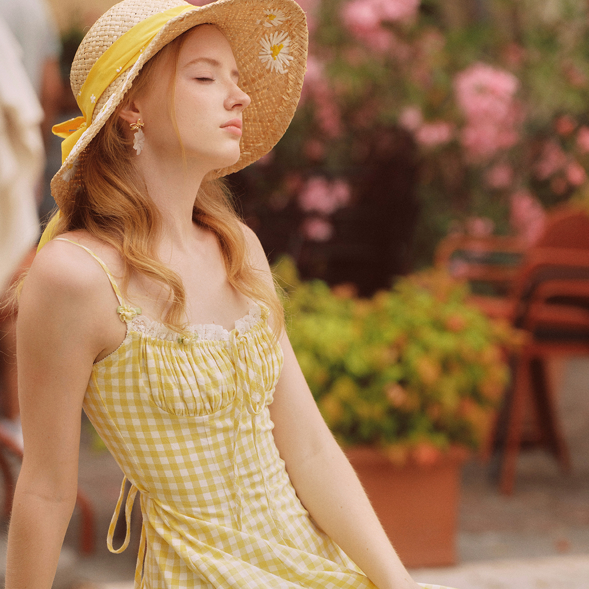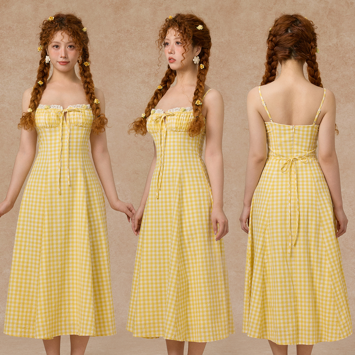 田园风设计感黄色格子吊带裙通勤连衣裙长款 法式 小柠檬 LaceMade