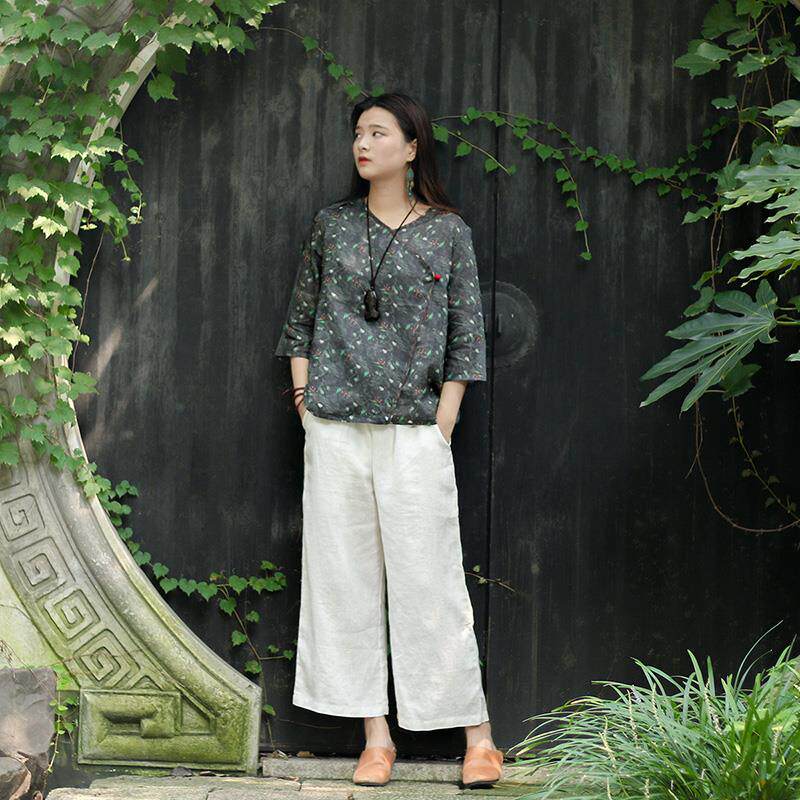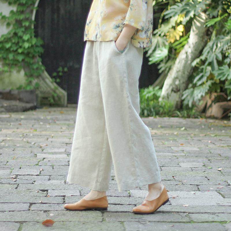 复古亚麻裤 棉麻阔腿裤 子九分裤 休闲裤 宽松高腰直筒裤 念家文艺女装