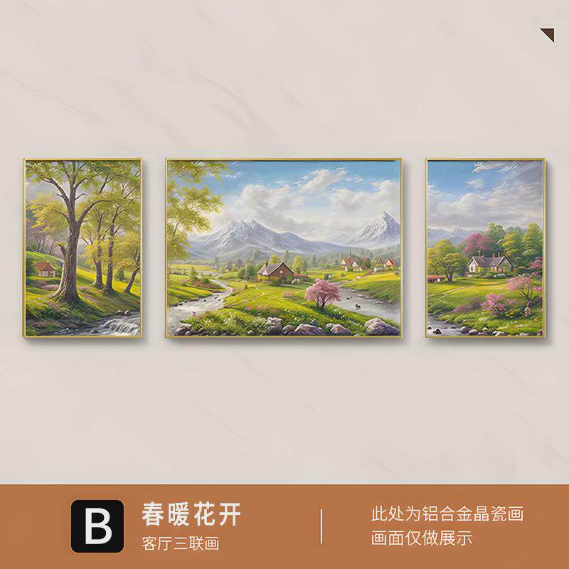 日照新款 饰画2024金山聚宝盆山水风景油画 客厅沙发背景墙三联画装