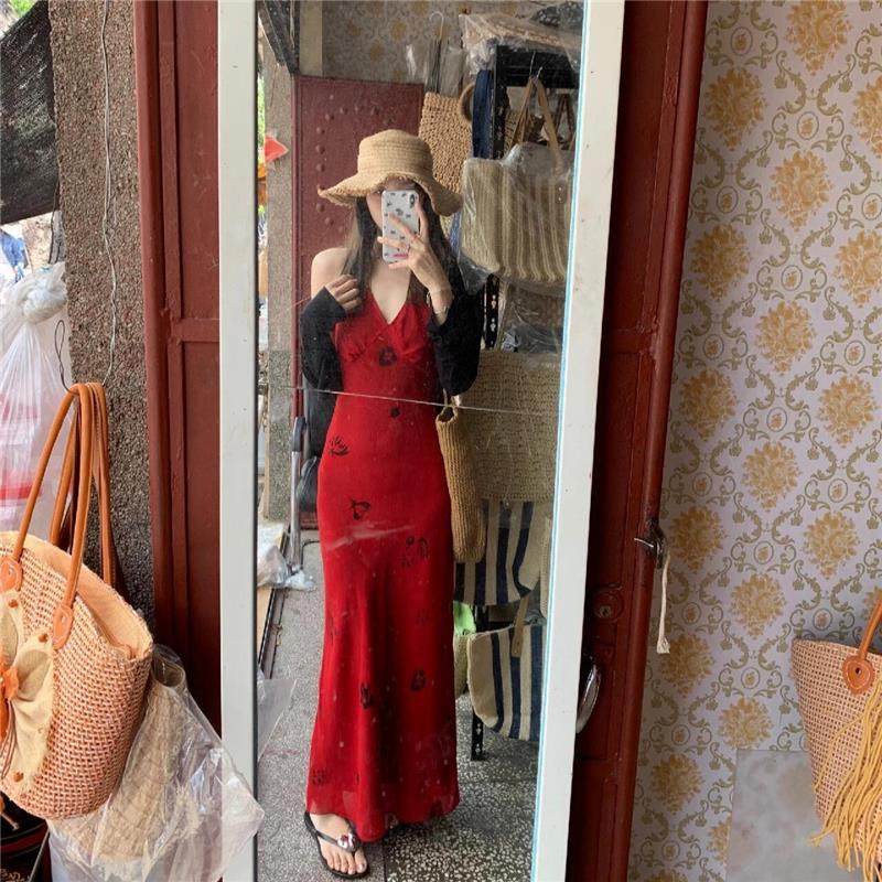 FUNOFF度假一字肩红色网纱假两件鱼尾连衣裙御姐纯色露腰拖地长裙