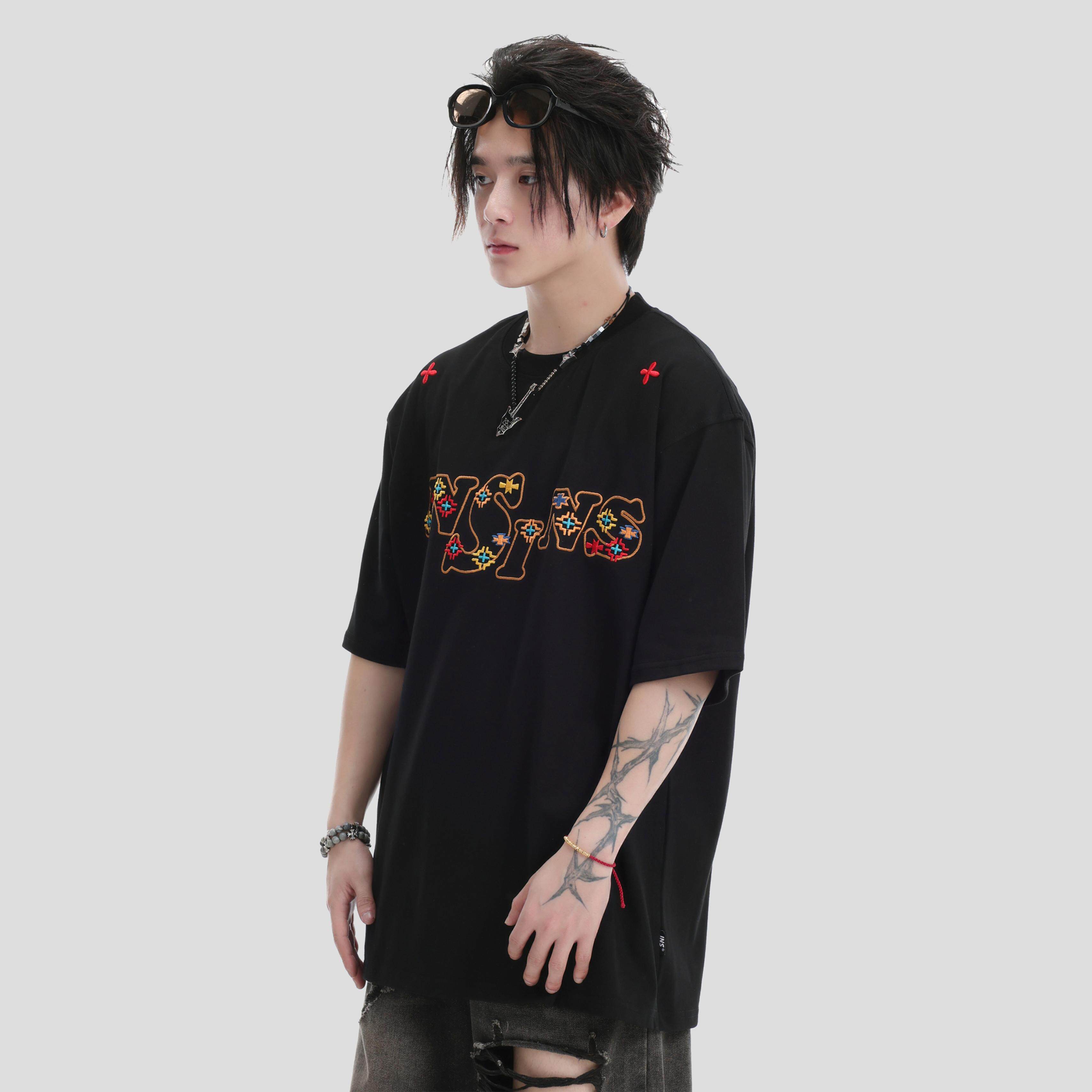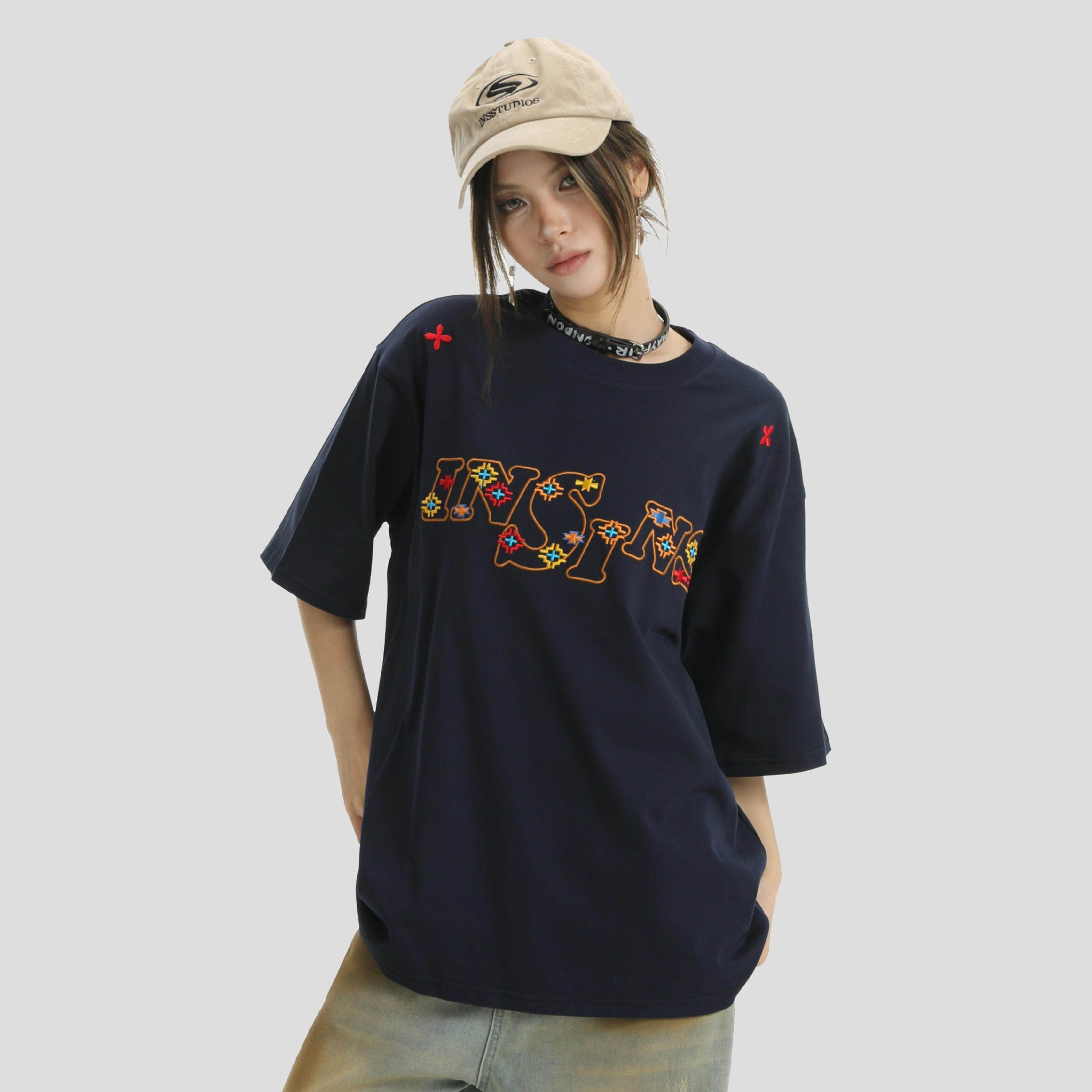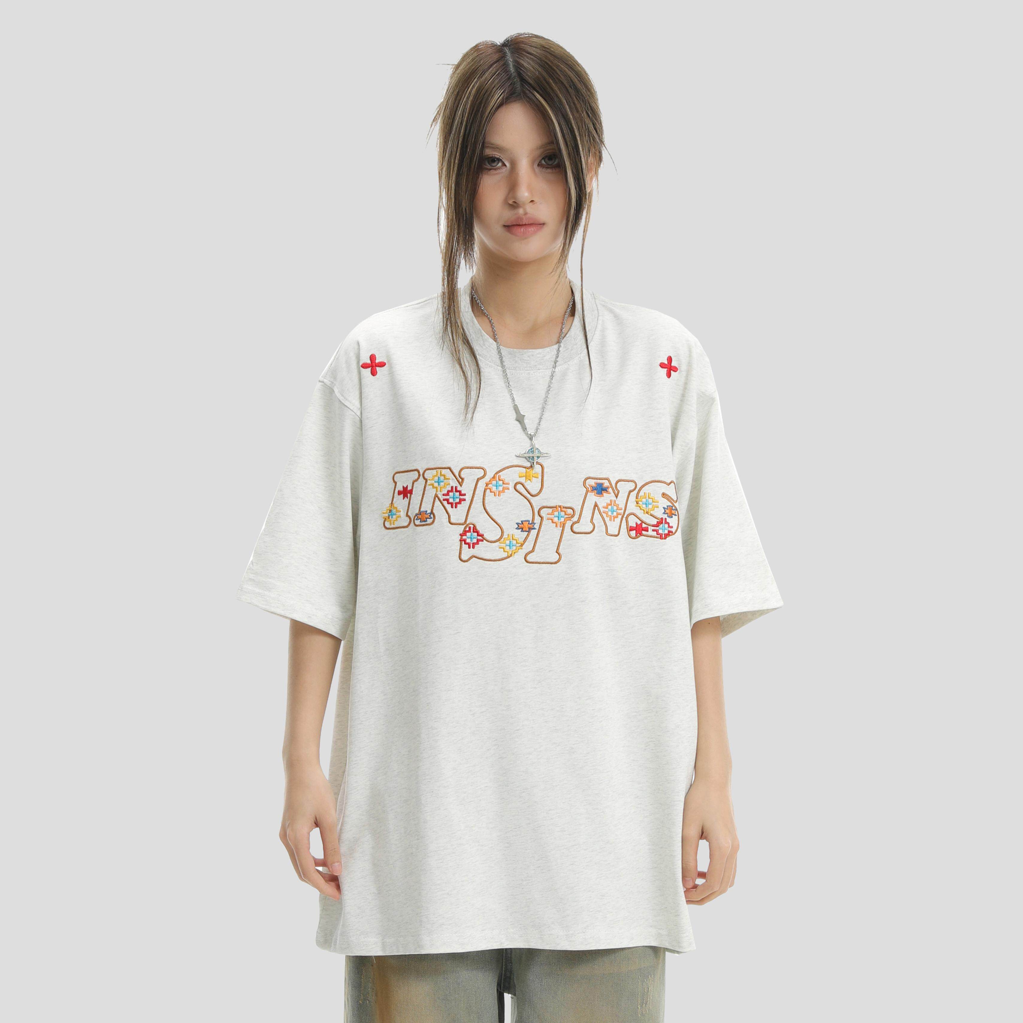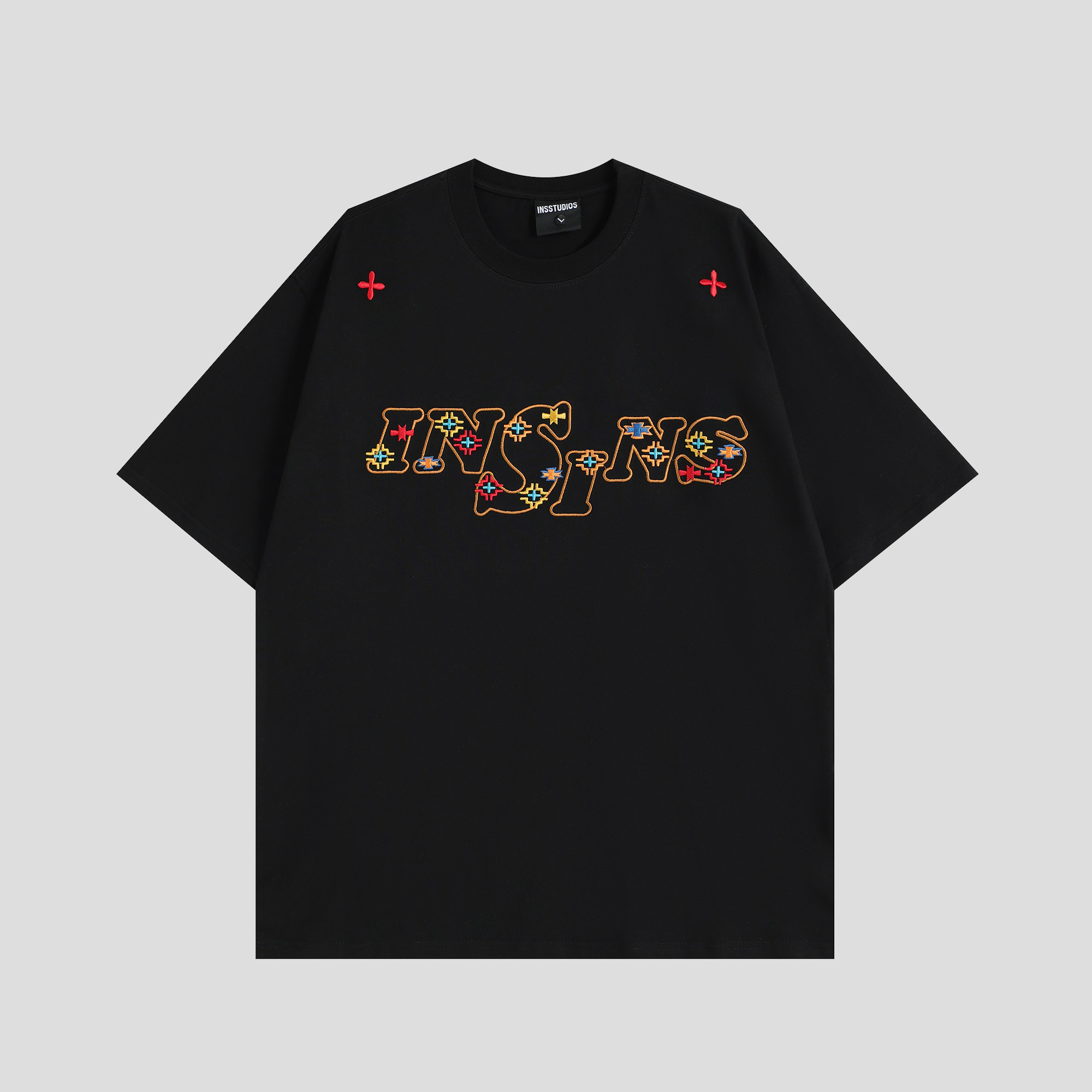 宽松纯棉半袖 复古几何刺绣LOGO短袖 T恤 国潮牌情侣美式 INSstudios