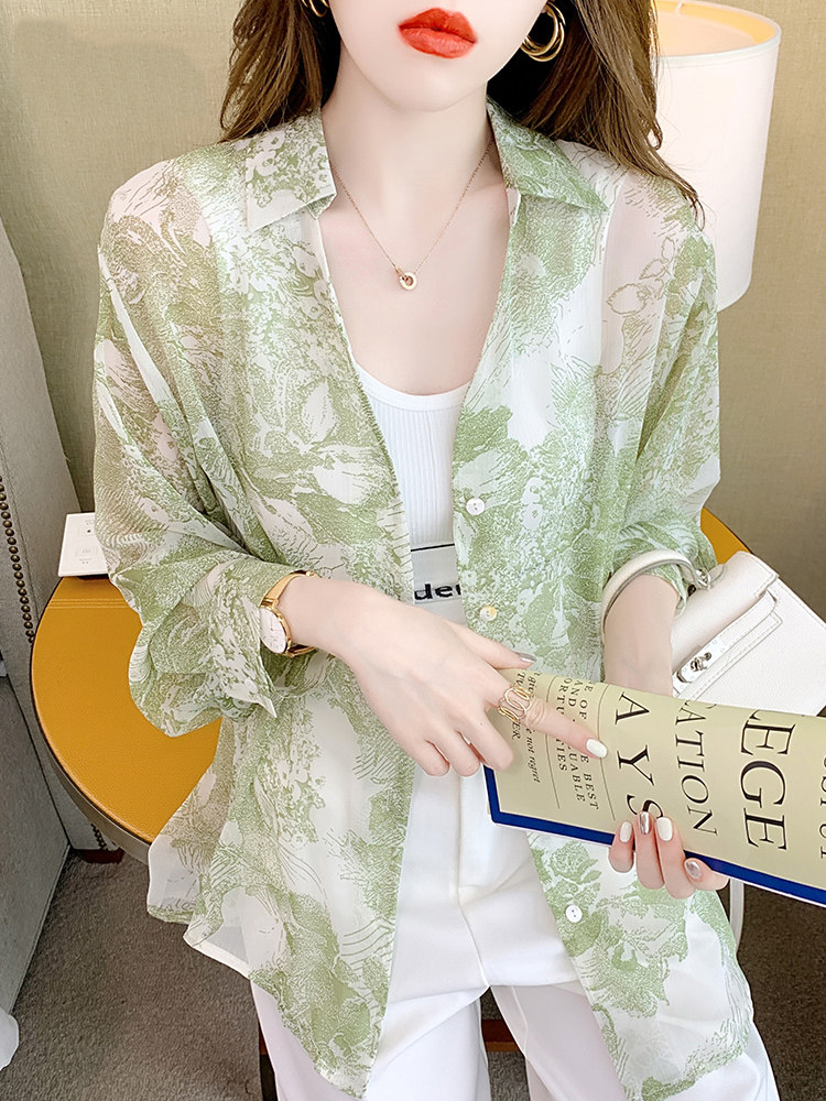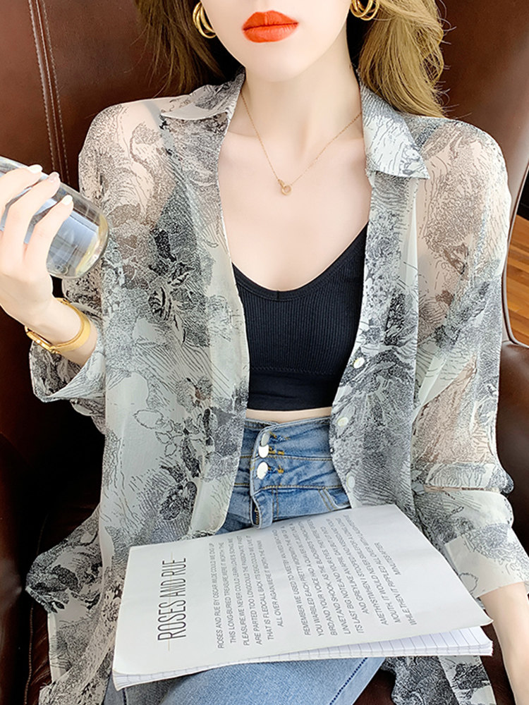 洋气雪纺开衫 扎染水墨画印花防晒衬衫 韩版 新款 外套别致上衣 女夏季