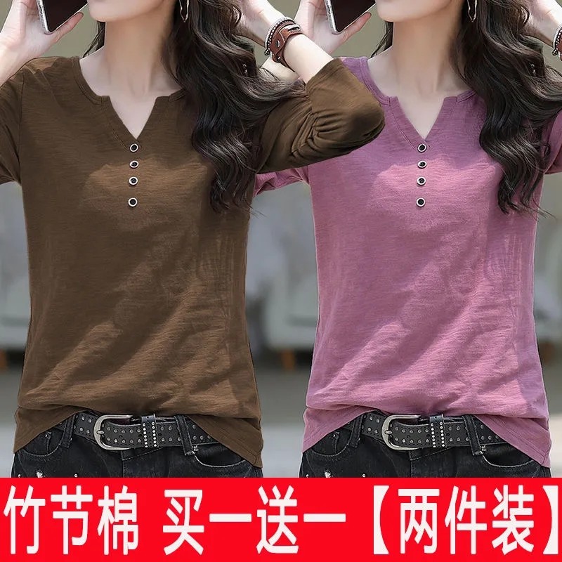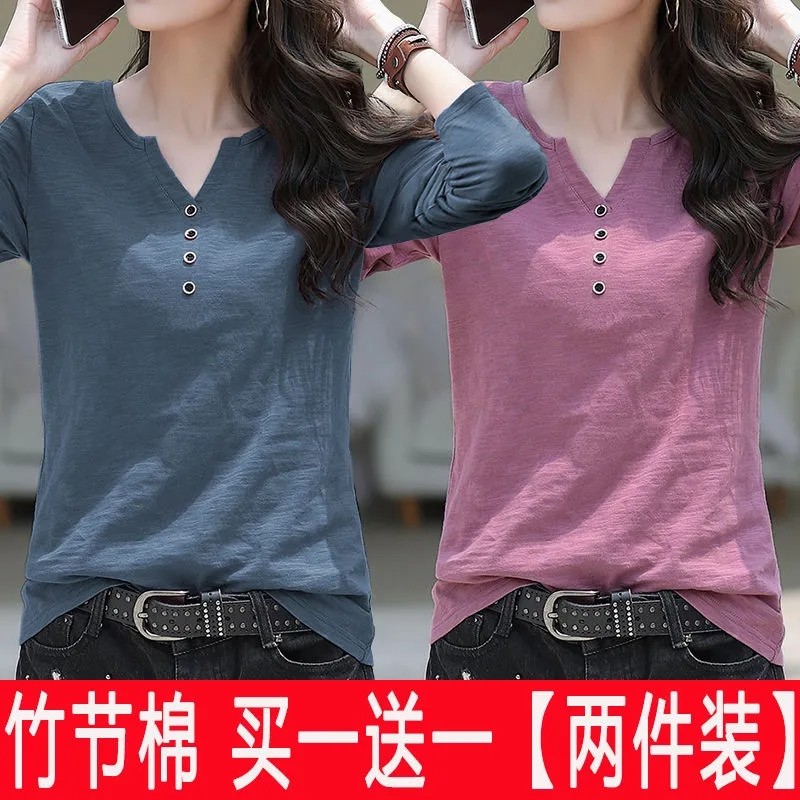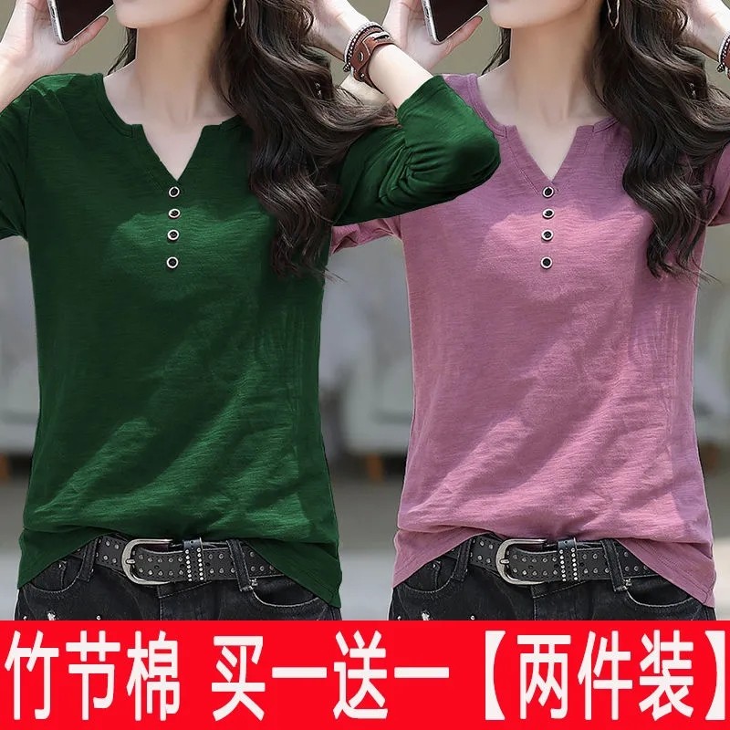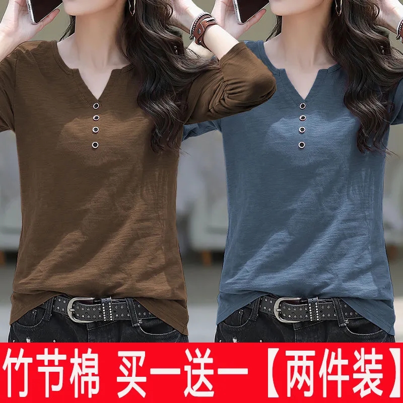 打底衫 t恤女2024春秋新款 宽松内搭外穿上衣女服 两件竹节棉长袖 单