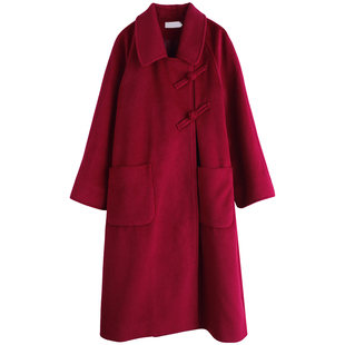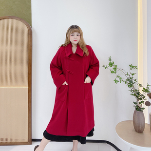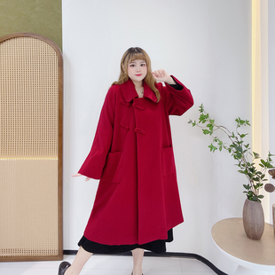 胖mm冬装 新中式 女装 长外套胖仙女莹莹大码 红色盘扣毛呢大衣 插肩袖