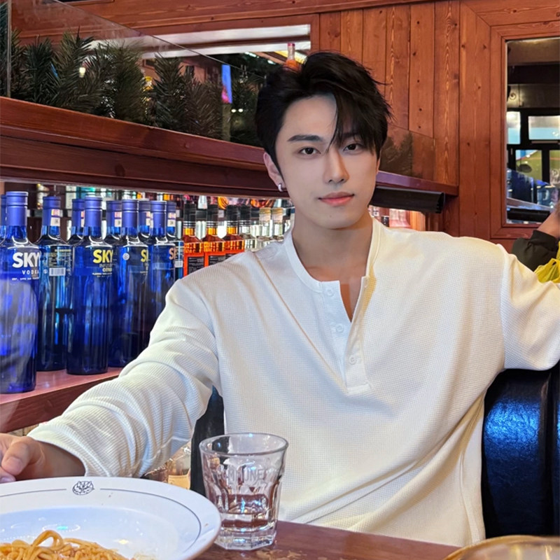 高级感上衣休闲内搭打底衫 美式 25年春季 T恤男款 亨利领华夫格长袖