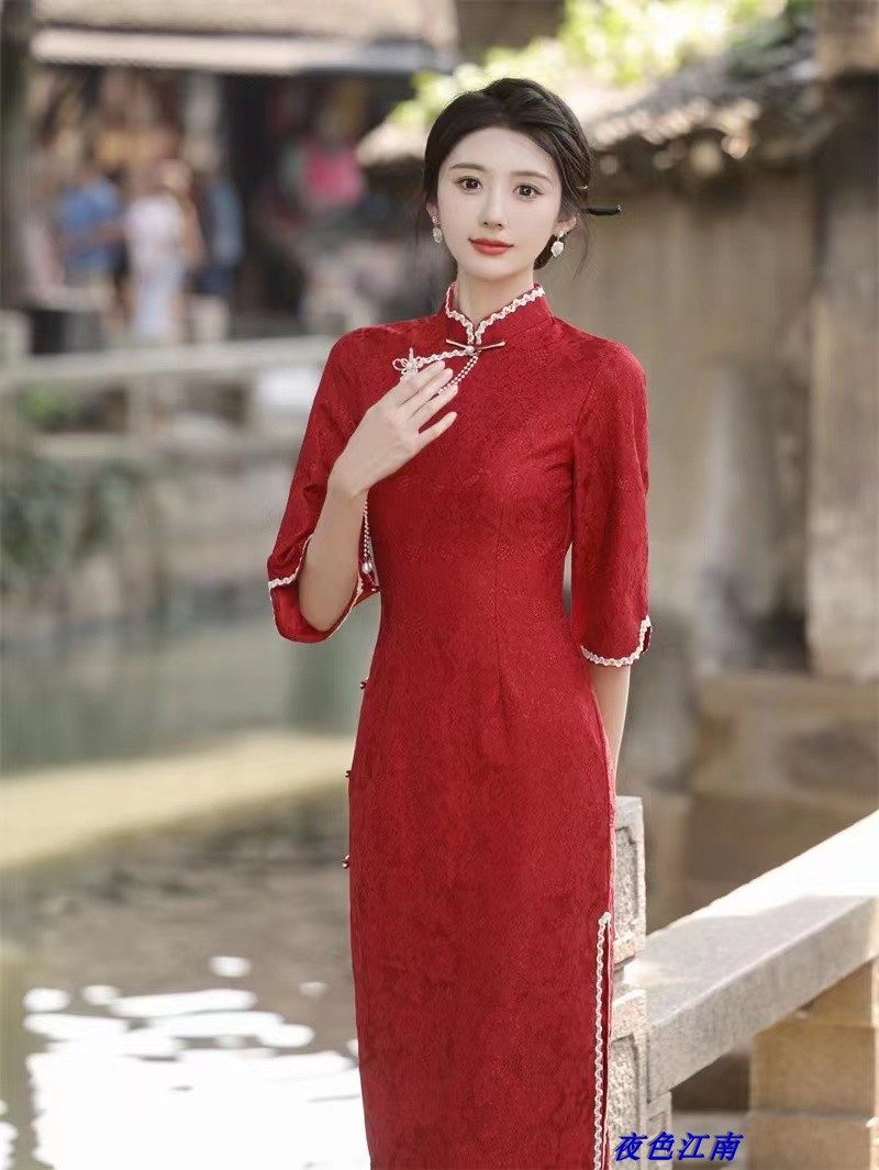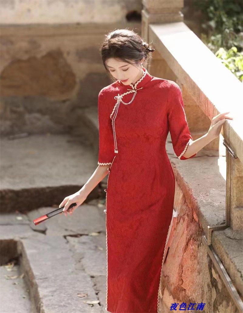 LHMknk1画报夫人原创自制秋冬温柔麂皮绒刺绣珠链旗袍 故宫之红