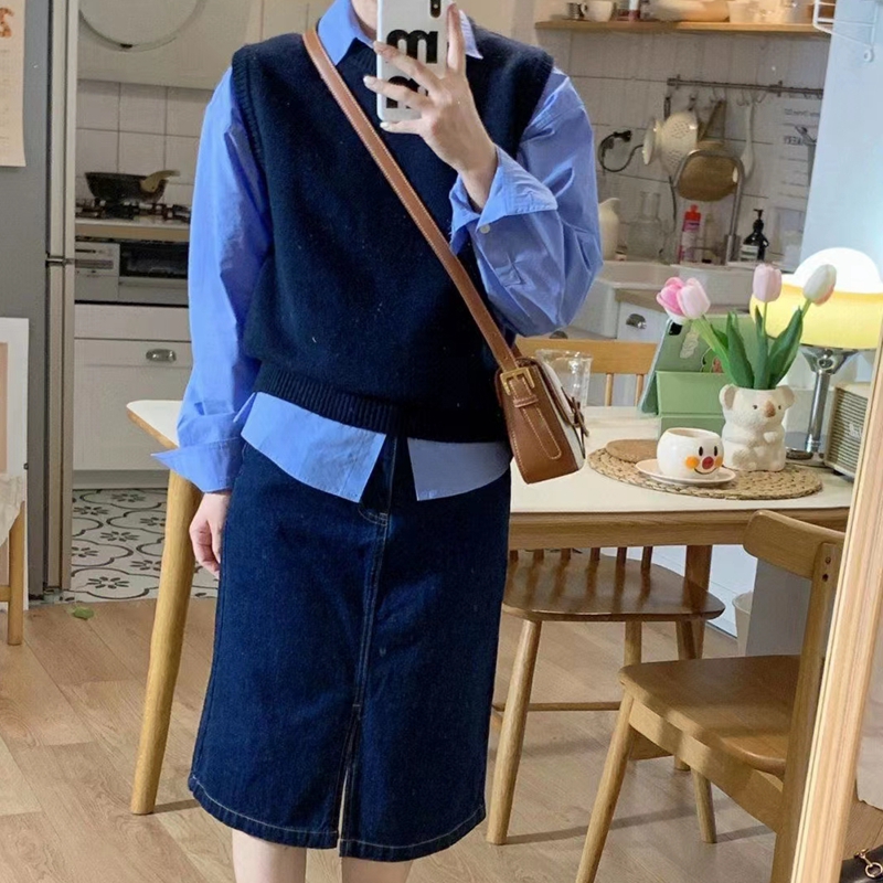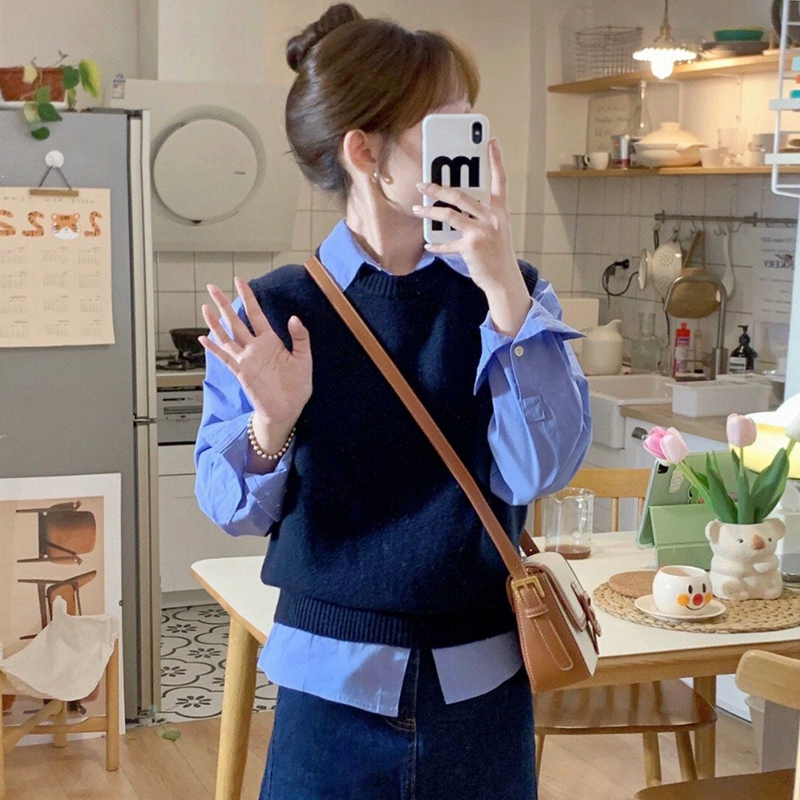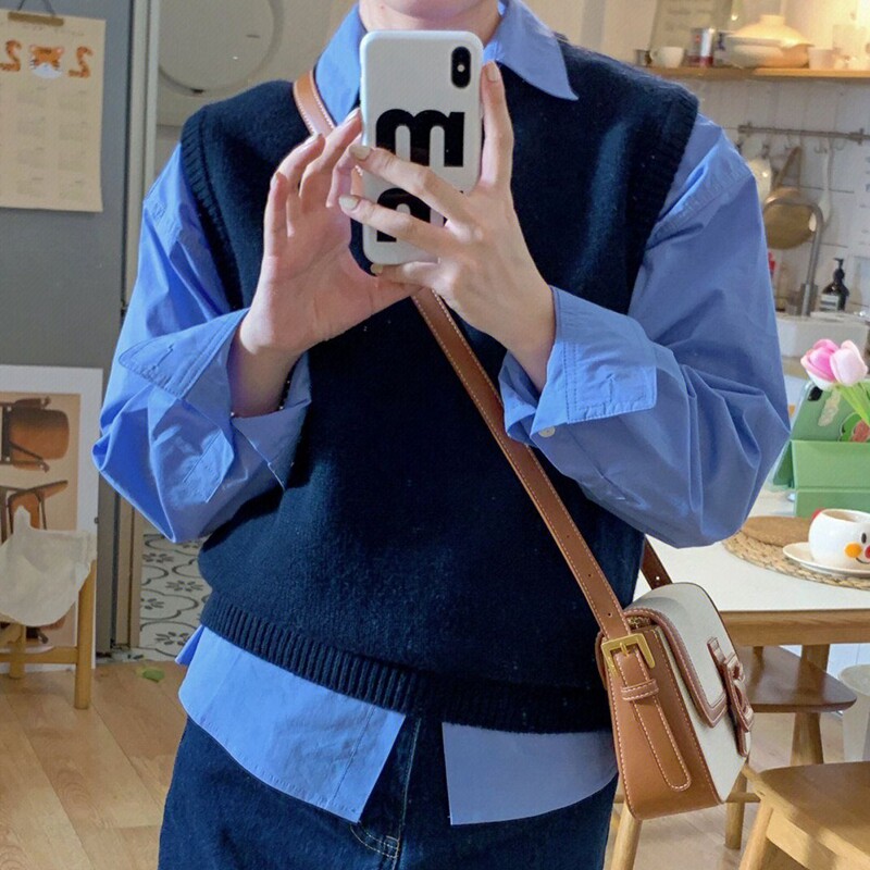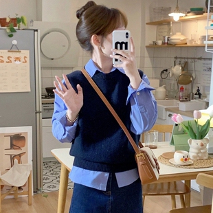 毛衣坎肩 短款 韩版 宽松藏蓝圆领羊绒马甲背心女2026春秋冬针织无袖