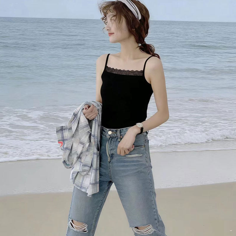 上衣夏 可外穿时尚 蕾丝莫代尔吊带背心女内搭一字领黑色修身 打底衫