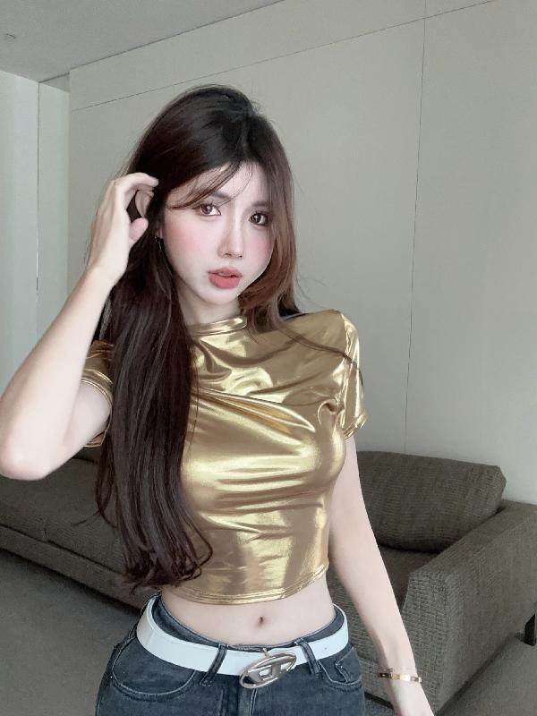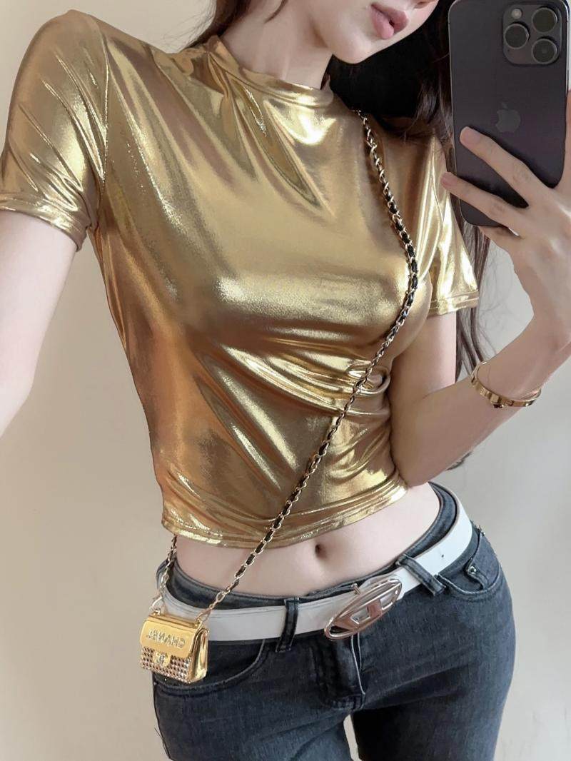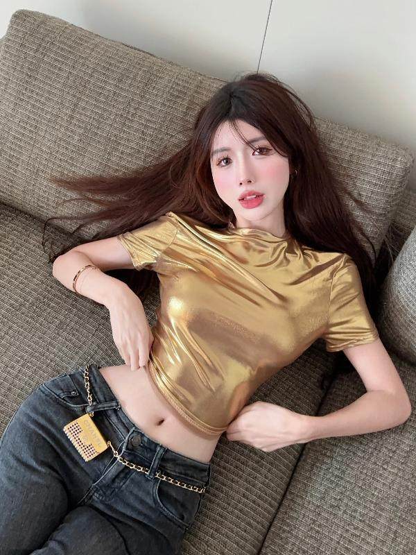金属亮面半高领pu皮短袖 小上衣 t恤女设计感小众夏热辣妹性感短款