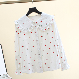 甜美白色棉麻上衣洋气碎花打底衫 娃娃领衬衫 新款 春季 外套 女长袖
