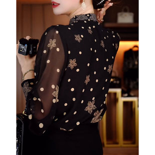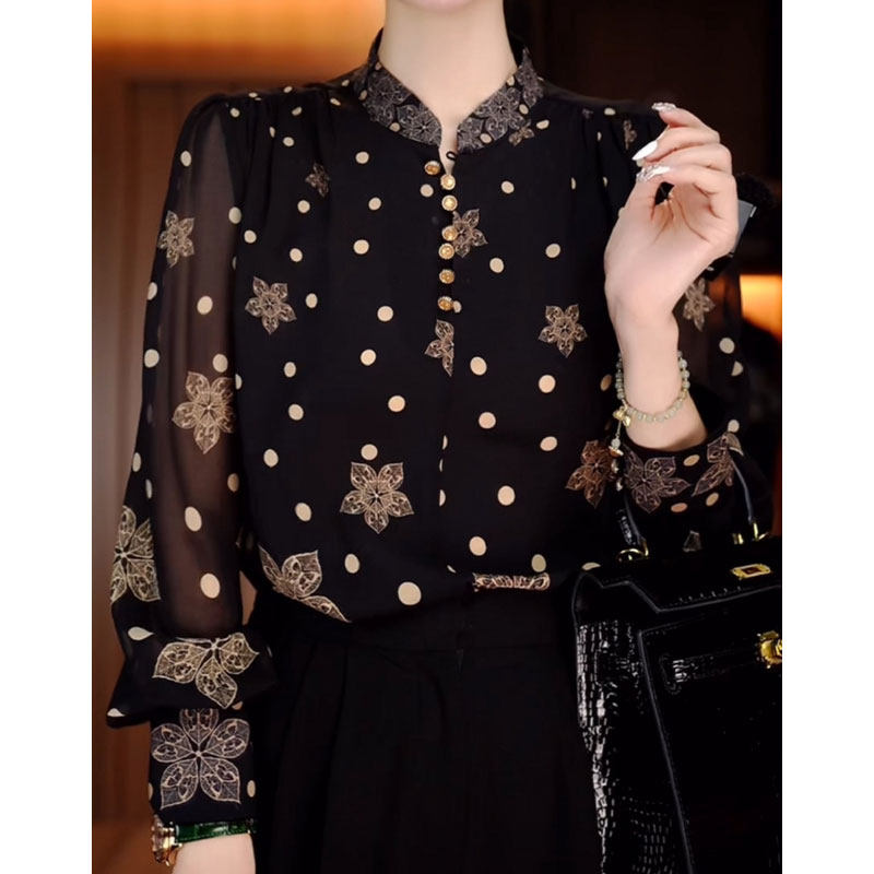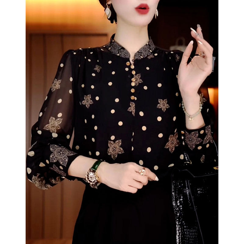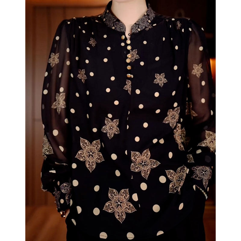 宽松遮肉长袖 时尚 新款 2024秋季 上衣女士 洋气圆点印花立领妈妈衬衫