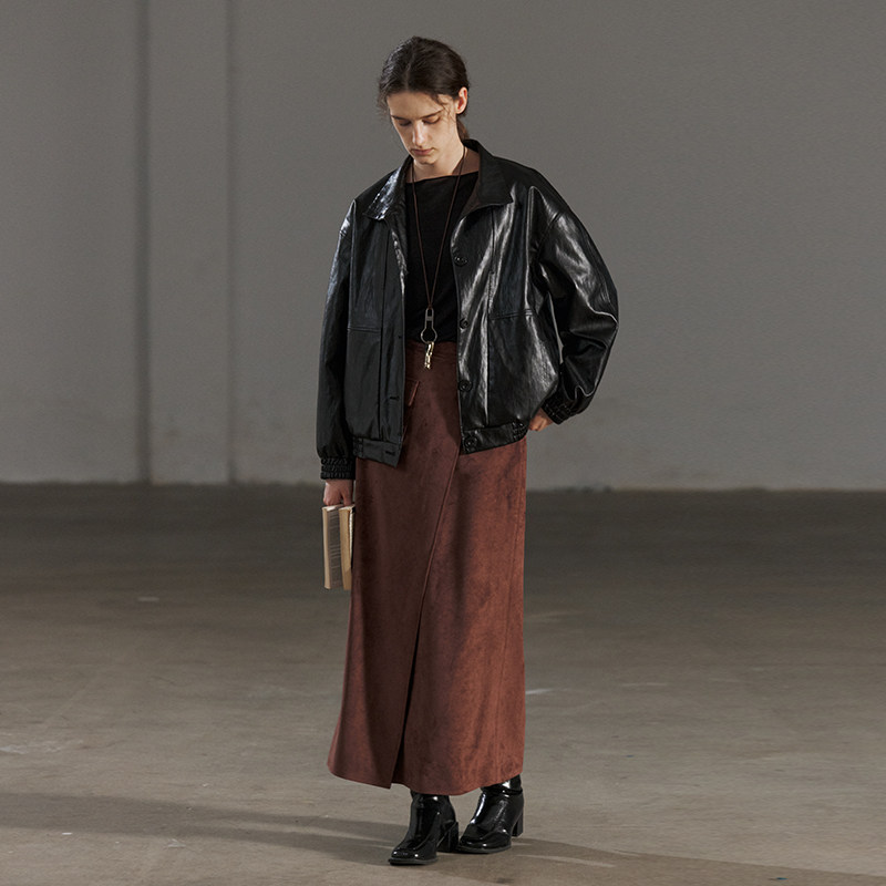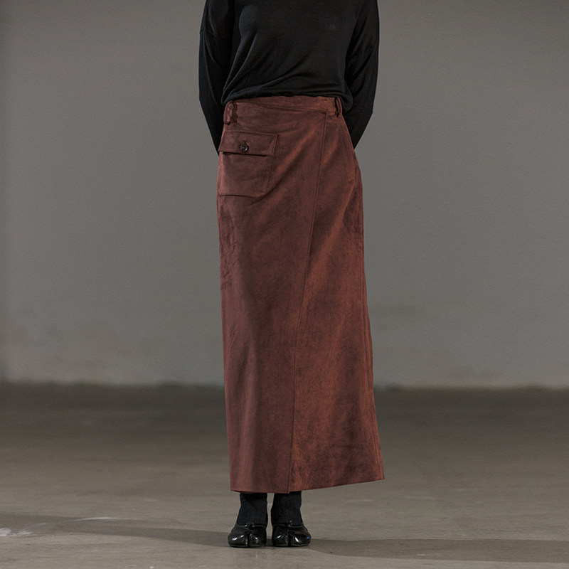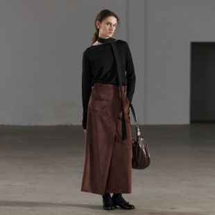 NON RESTRAIN艺术感麂皮绒A字半身裙女不规则中高腰显瘦开衩长裙