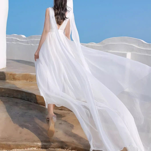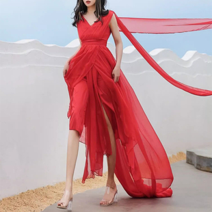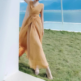 夏季 超仙旅游度假真丝桑蚕丝连衣裙沙滩沙漠拍照拖地超长裙子 无袖