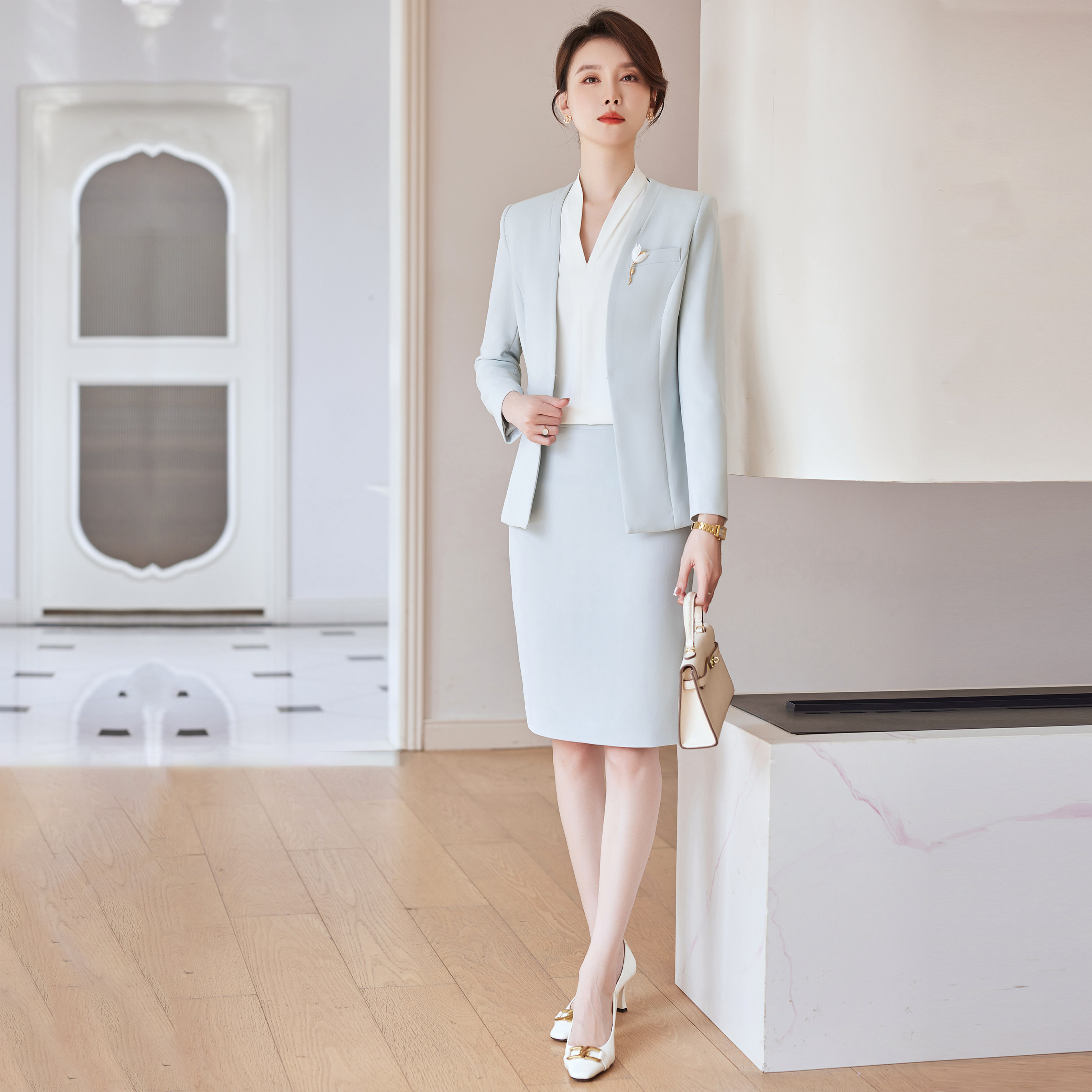 西服职业正装 春秋女神范气质名媛高端洋气长袖 套裙 套装 浅蓝色西装