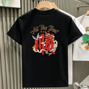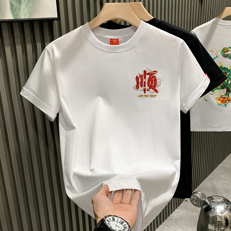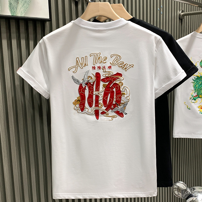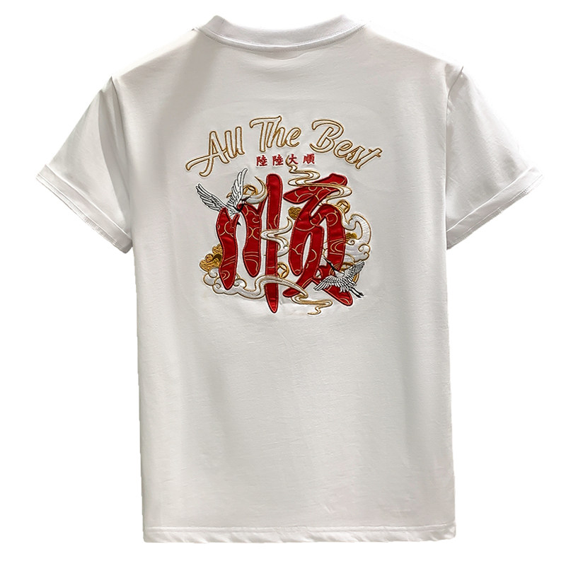 欧货国潮陆陆大顺文字刺绣设计感轻奢男T恤短袖 百搭体恤 纯棉半袖