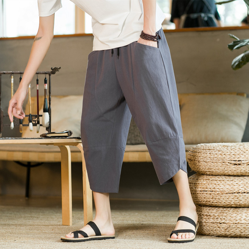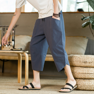 纯棉薄款 夏季 大码 宽松休闲亚麻裤 棉麻八分裤 潮流胖子九分裤 男士