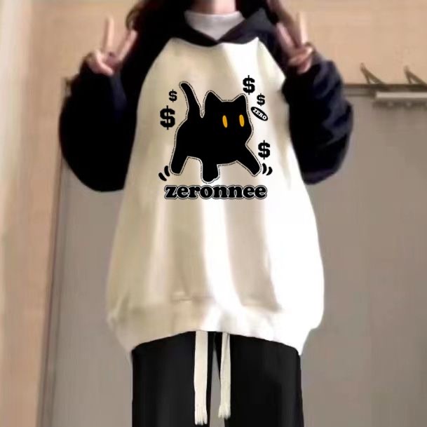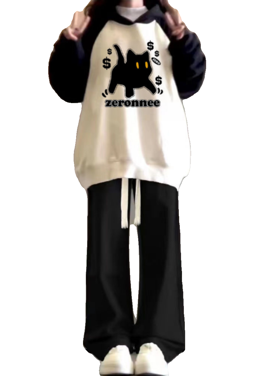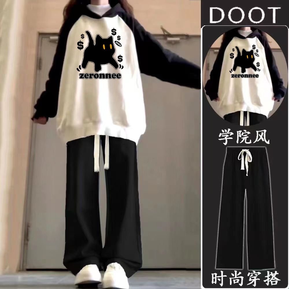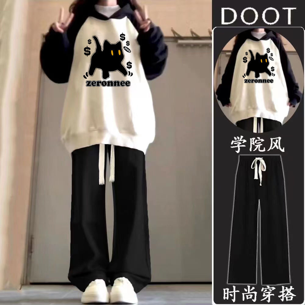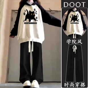初中学生宽松插肩撞色连帽卫衣阔腿裤 女2025新款 两件套 套装 秋冬季