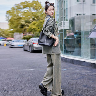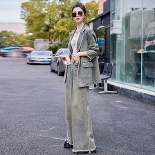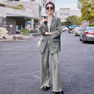 外套阔腿裤 复古气质牛仔套装 西装 新款 宽松休闲两件套 女2024春秋季