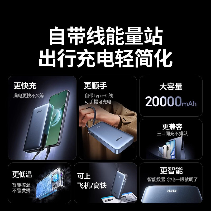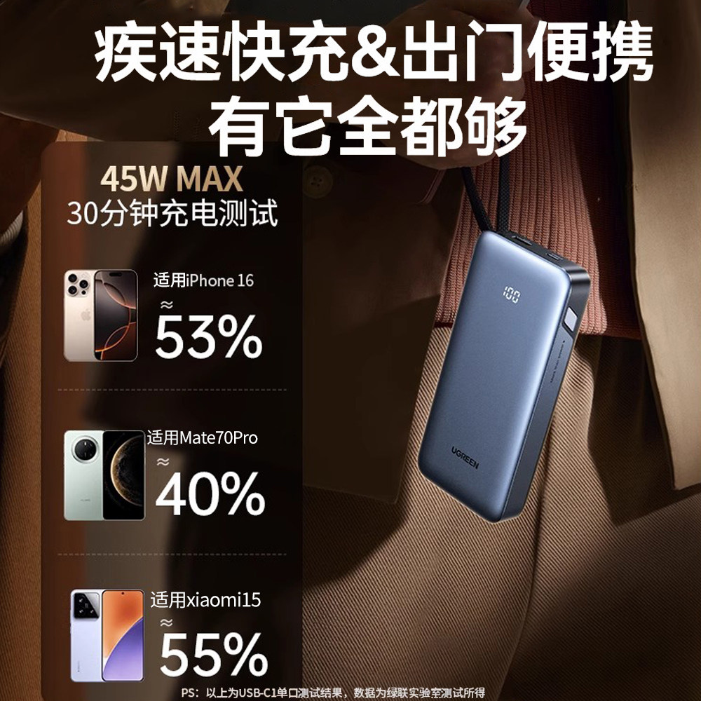 45W快充自带线充电宝便携适用iPhone17 绿联2025新款 16pro手机可上飞机高铁2万毫安大容量移动电源 3C认证
