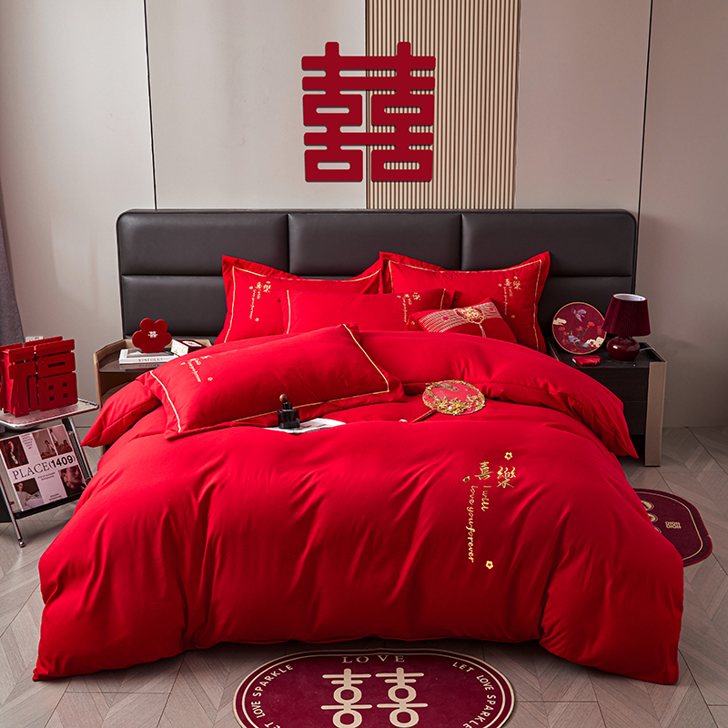 结婚大红色床单四件套轻奢简约水洗磨毛新娘婚庆陪嫁床笠套件被套