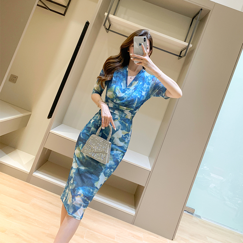 女装 气质大码 网纱V领绑带收腰中长裙 新款 蓝色水墨印花连衣裙夏季