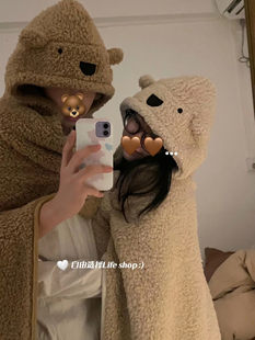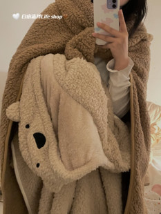 卡通小熊披风可爱秋冬加厚保暖毛毯披肩带帽学生午休午睡毯子斗篷