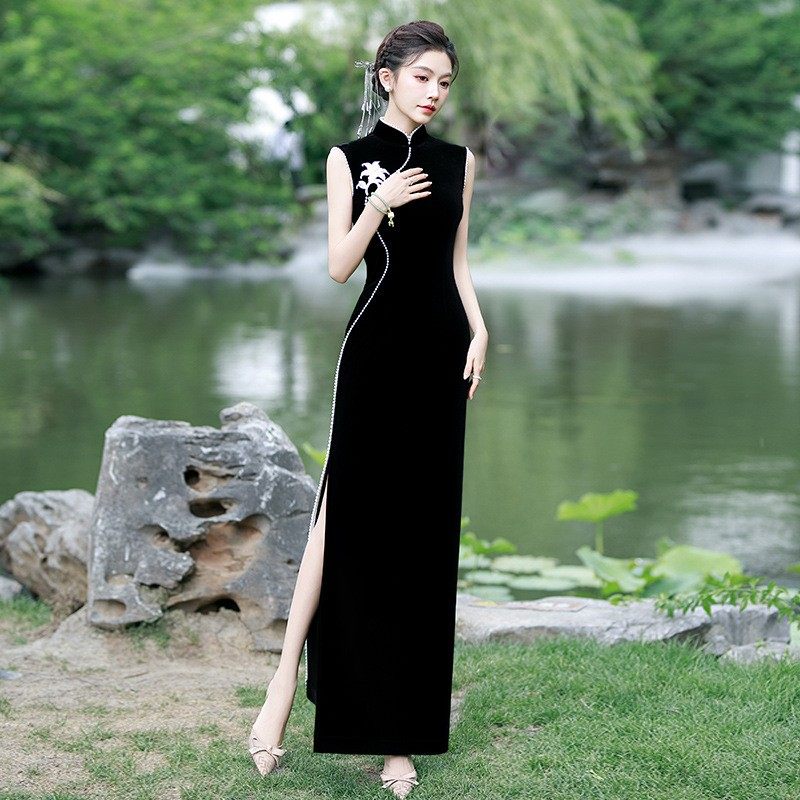 国风复古丝绒长款 学员训练功服女 单开叉古典舞旗袍形体走秀加大码