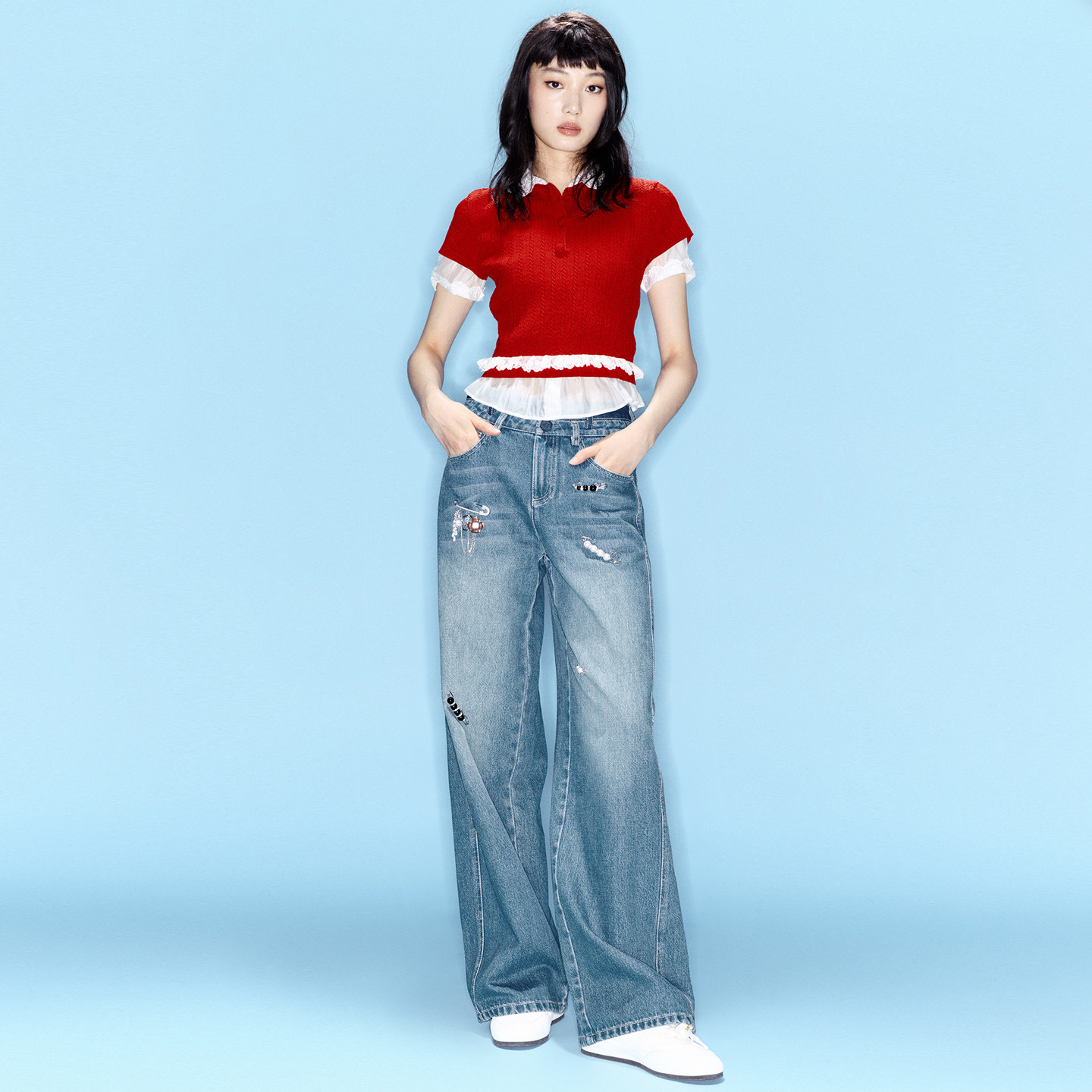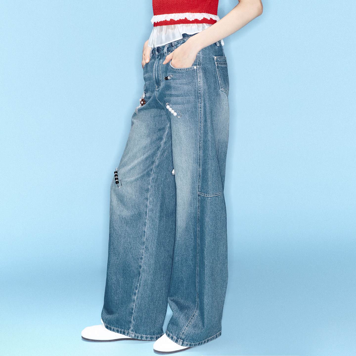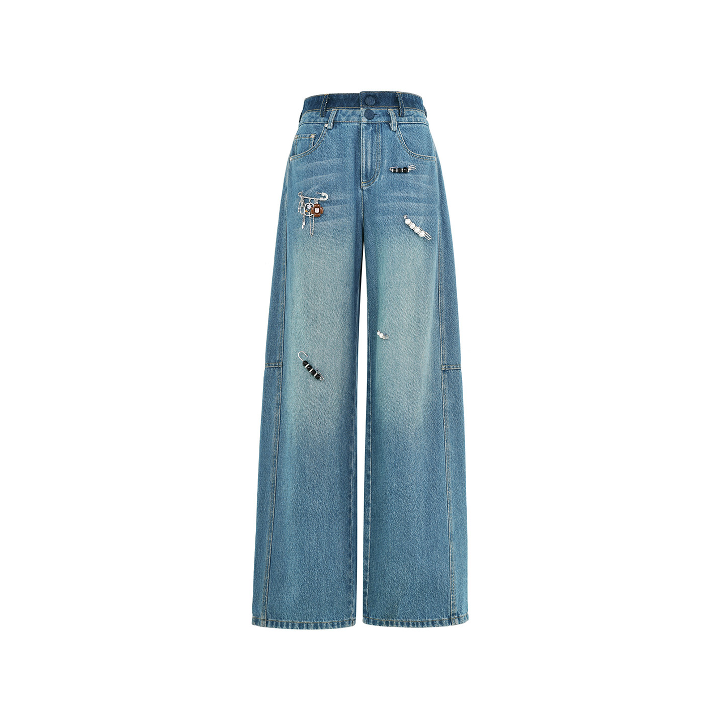 直筒阔腿裤 通勤复古趣味别针牛仔长裤 女 新款 lefame拉飞姆春季