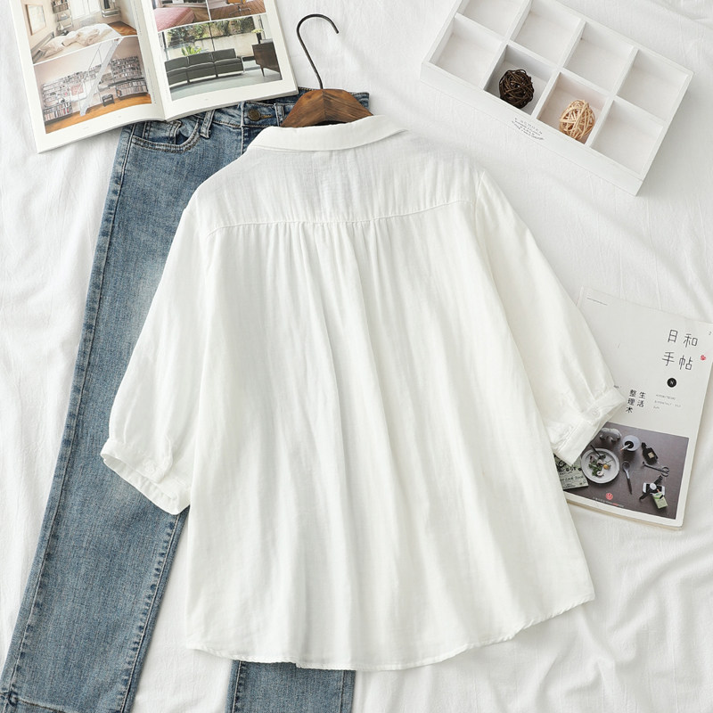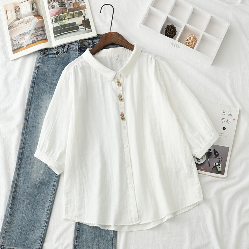 纯棉柔软半袖 女宽松百搭文艺刺绣兔子夏装 衬衣 衬衫 双层棉纱短袖