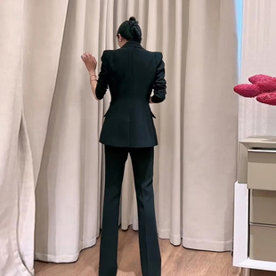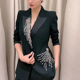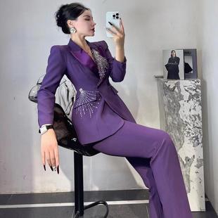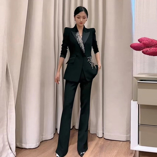两件套正装 高级感气质职业套装 外套春夏瘦腿微喇裤 西装 镶钻泡泡袖