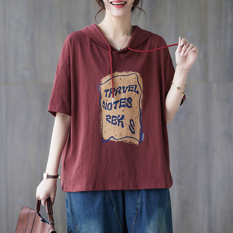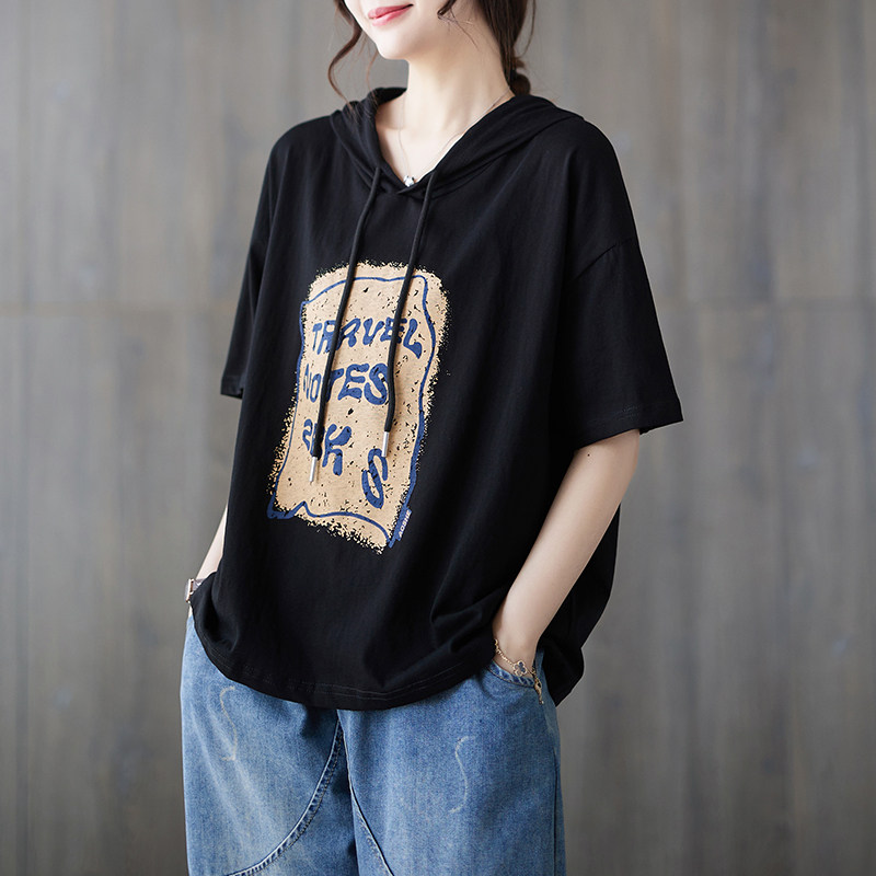 字母印花连帽短袖 胖mm夏季 T恤女宽松休闲遮肉显瘦上衣潮 女装 大码
