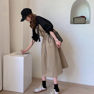 收腰连衣裙泡泡袖 2024新款 显瘦长款 女夏宽松韩版 两件套 背带裙套装