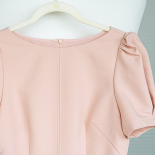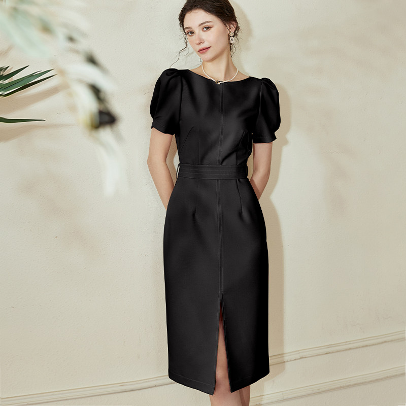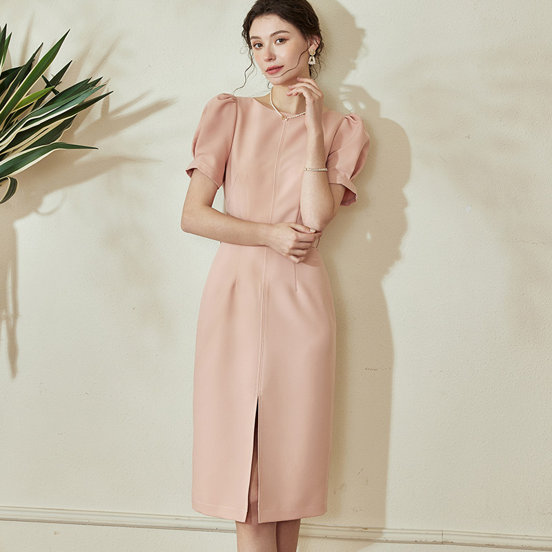 粉色修身 新款 内搭中长裙08586 开叉连衣裙2025夏装 罗衣气质泡泡袖