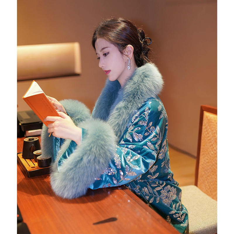 鎏璃蓝珠片刺绣90白鹅绒狐狸毛羽绒服套装 新中式 繁花 澄渔高定