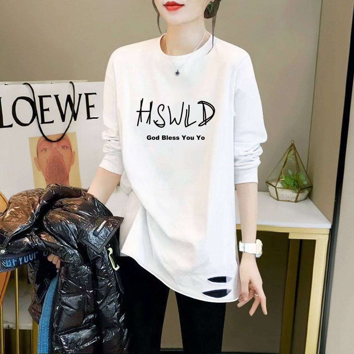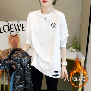 叠穿t恤上衣 女内搭春秋遮屁股字母长袖 中长款 破洞纯棉白色打底衫